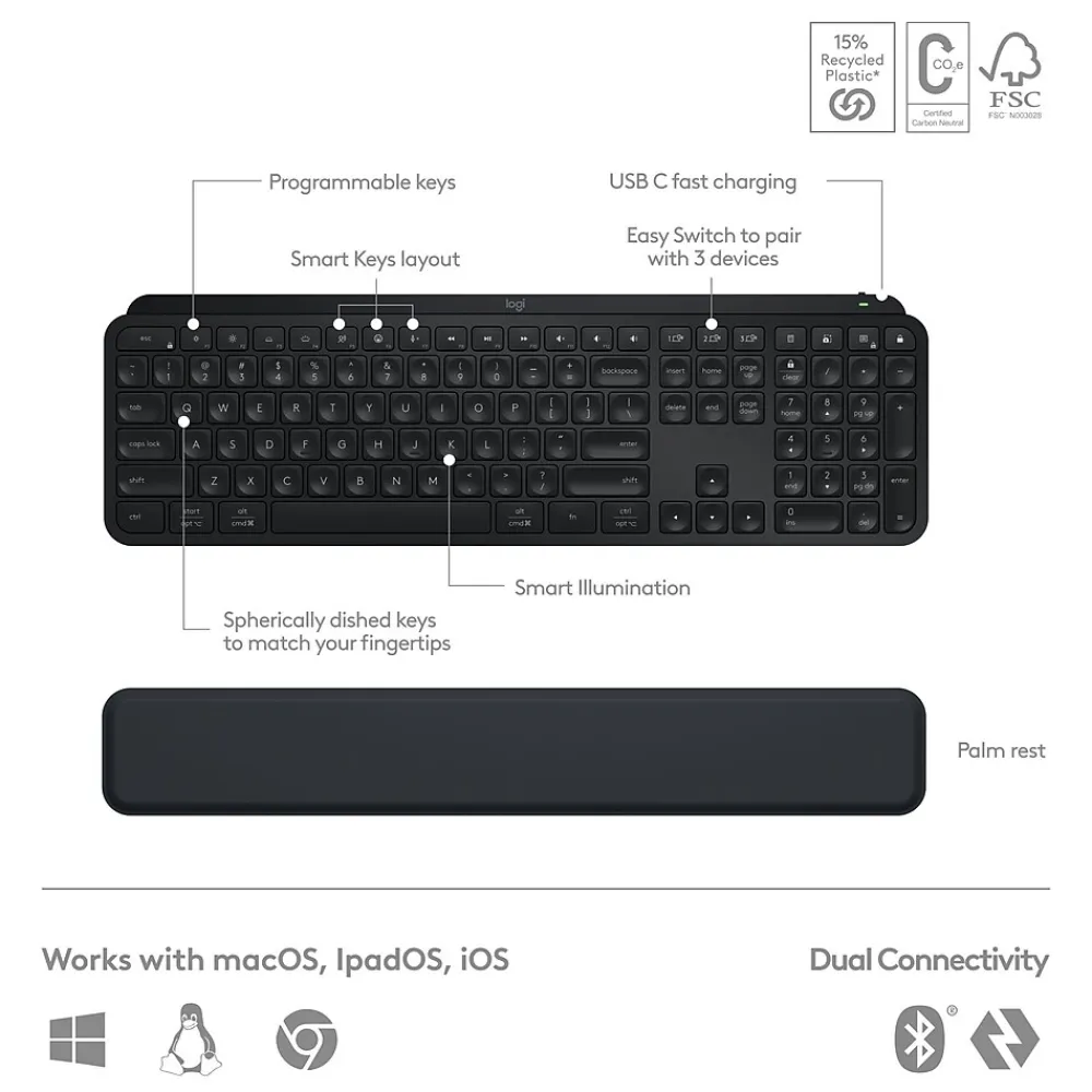 - BACKLIT KEYBOARD keys light up as your hands approach and adapt to the environment; now with more lighting customizations on Logi Options+