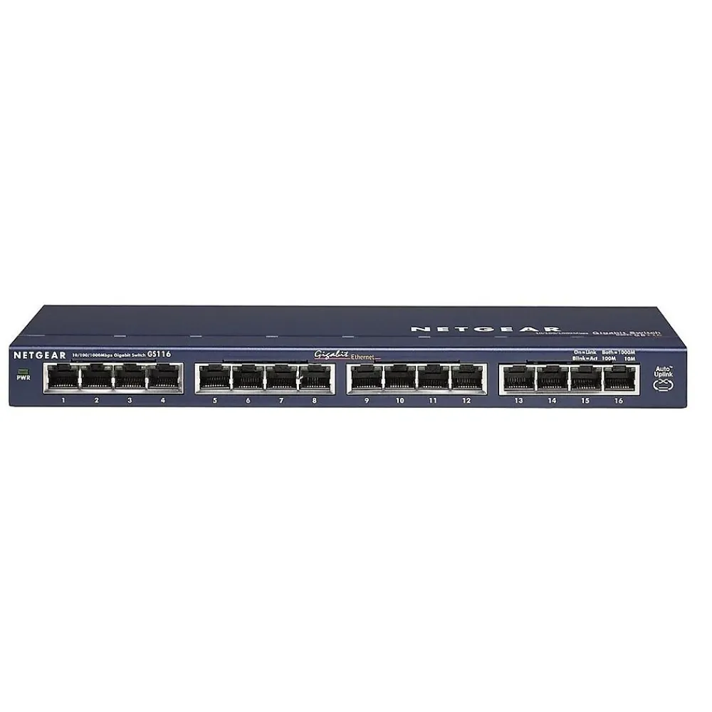 Now you can put together a powerful, high-speed network on a small scale. NETGEAR’s GS116 Copper Gigabit Ethernet Switch lets you build a system that can move even very large files across your network instantly — up to 2000Mbps on each port. The standards-based GS116 helps to protect customers’ existing and future network infrastructure investments by painlessly integrating other 10, 100, 1000 devices as well as honoring layer 2 802.1p priority tags. Packed with ease-of-use features, this adaptable switch supports either PC or Macintosh operating systems. The compact size makes it ideal for home, small office, workgroups, departments and conference room environments. Its durable metal case has no fan for silent operation.; Features; High-speed, auto-switching 10/100/1000Mbps Ethernet connection; Silently delivers up to 2000Mbps on each port; Integrates 10, 100, & 1000Mbps devices within a network; Honors Layer 2 802.1p traffic priority tags; Space-saving desktop dimensions; Package Contents;16-port Gigabit Switch GS116;Wall-mount kit; AC adapter; Installation guide; Warranty/Support information card