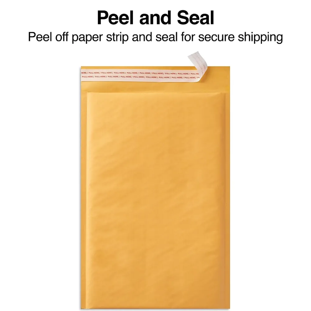 Increase mass mailing productivity with these large kraft peel-and-seal bubble mailers. The gummed flap eliminates the need for moisture, and the paper strip keeps the flap free of dust until ready for use. Heat-welded seams and a strong adhesive keep merchandise from slipping out during transit. These Staples 13.13 x 17.75-inch peel-and-seal bubble mailers feature kraft paper construction to help camouflage the contents and provide a clean background for handwritten addresses or printed labels.