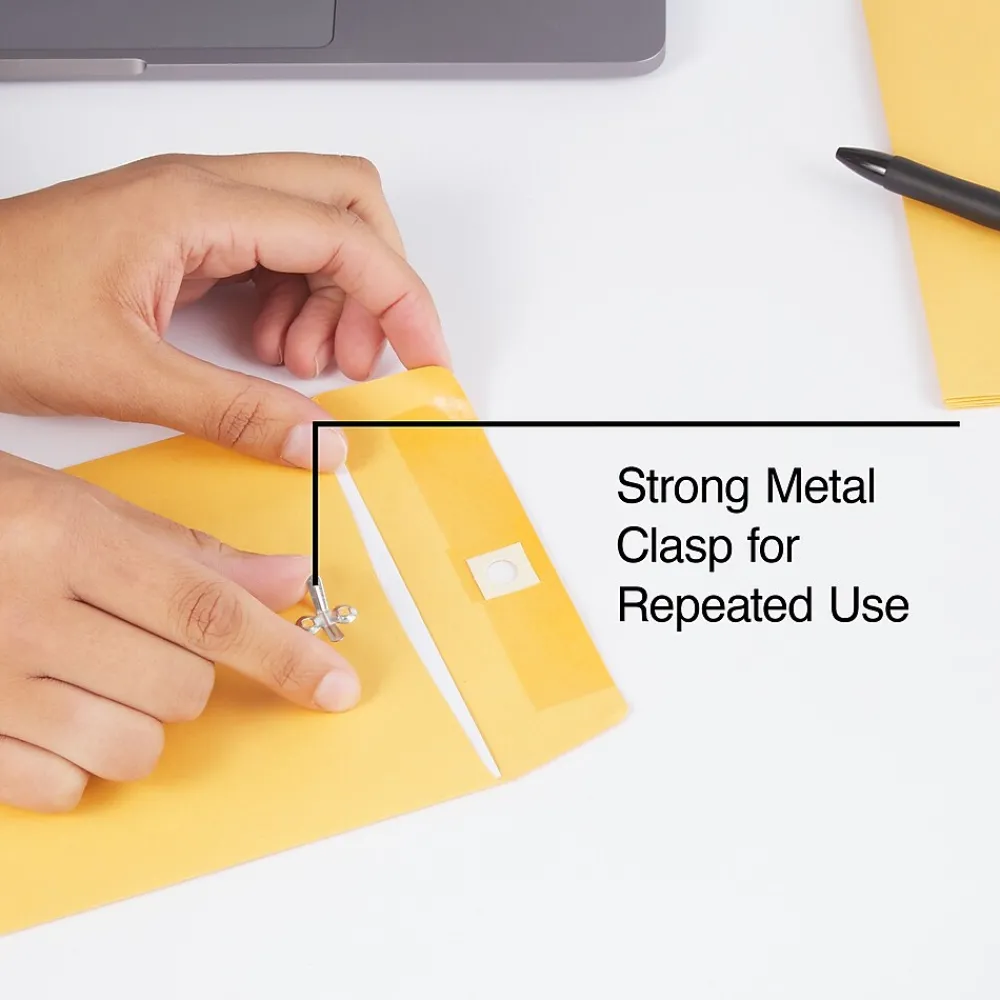 Keep literature clean and damage-free with this 100-pack of brown kraft clasp envelopes. Each one boasts a heavily gummed flap seal and a strong metal clasp to keep whatever you insert safe and sound while letting you reuse it as necessary. These Staples brown kraft clasp envelopes are built with 28-pound kraft stock to provide the durability required for safe shipping.