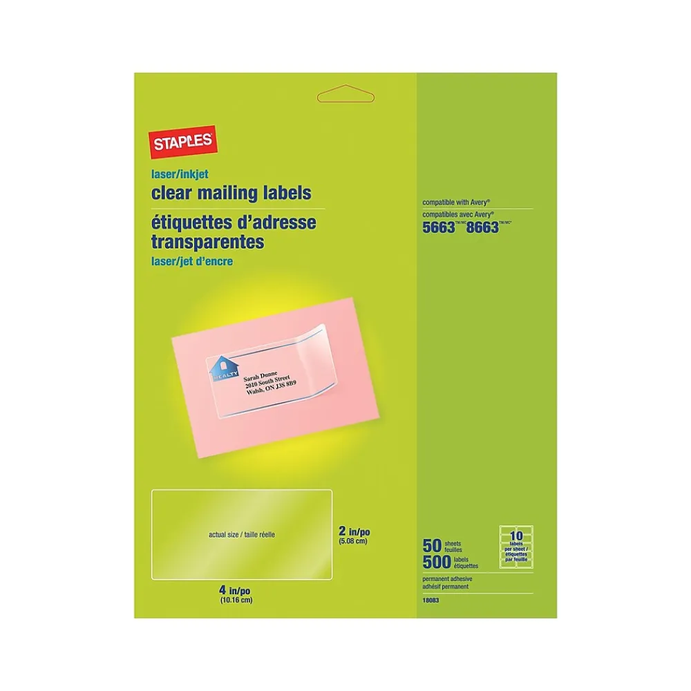 Give envelopes and packages a professional look with these Staples 2 x 4-inch clear shipping labels. Each label can be custom designed and printed via any compatible inkjet or laser printer for professional, personalized labels. These Staples 2 x 4-inch clear shipping labels are coated with a permanent adhesive, so you can be sure that they stay wherever you stick them.