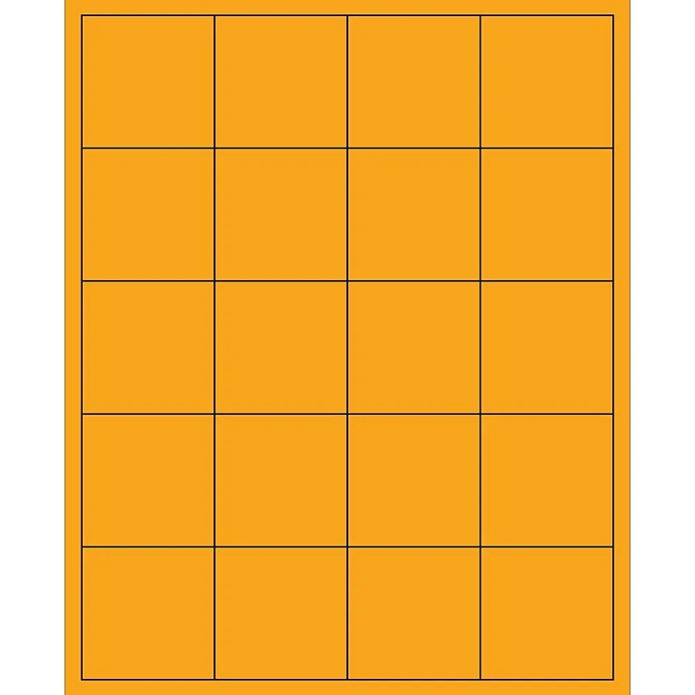 2″ x 2″ Fluorescent Orange Rectangle Laser Labels. Use to create your own product or mailing labels. Labels work with both Laser and ink jet printers. Permanent adhesive. Labels stick to a variety of smooth surfaces including paper, corrugated, plastic, wood, glass and metal.
