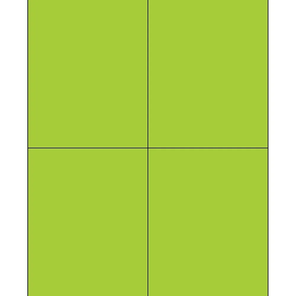4 1/4″ x 5 1/2″ Fluorescent Green Rectangle Laser Labels. Use to create your own product or mailing labels. Labels work with both Laser and ink jet printers. Permanent adhesive. Labels stick to a variety of smooth surfaces including paper, corrugated, plastic, wood, glass and metal.