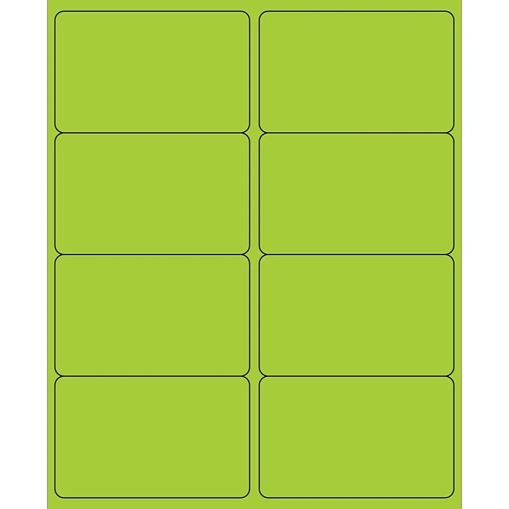 4″ x 2 1/2″ Fluorescent Green Rectangle Laser Labels. Use to create your own product or mailing labels. Labels work with both Laser and ink jet printers. Permanent adhesive. Labels stick to a variety of smooth surfaces including paper, corrugated, plastic, wood, glass and metal.
