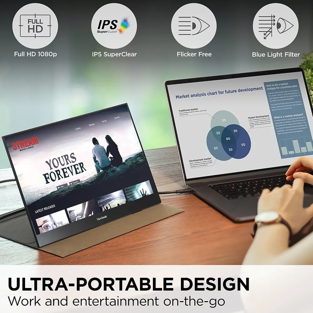 The ViewSonic® VX1655 is a 15.6” portable monitor with 1080p resolution for incredible visual performance on the go. An ultra-thin panel with the hardware integrated into the kickstand provides incredible stability, discreetly hides cable connectivity, and still allows for use in portrait and landscape modes. A convenient tripod mount is integrated into the stand for additional versatility. In addition, versatile connectivity options include two USB-C ports for 2-way charging, as well as mini-HDMI and a headphone jack. Measuring less than an inch thick and weighing under two pounds, the ultra-slim VX1655 perfectly fits into any bag, briefcase, or backpack so you can work wherever life takes you.