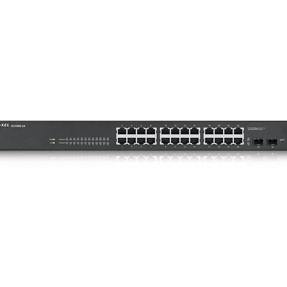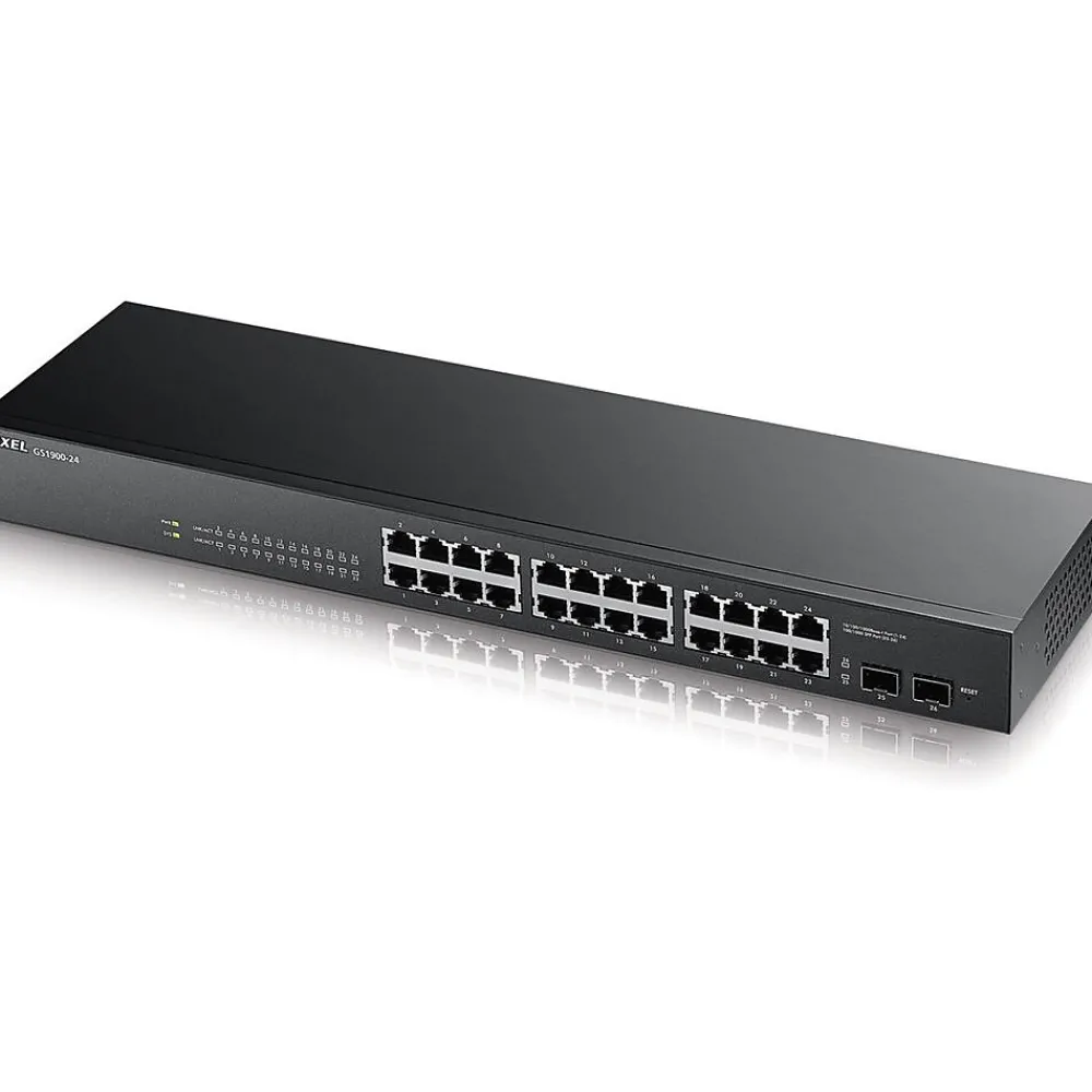 Zyxel 24 Port smart managed switch supports green Ethernet IEEE 802.3az with high-power PoE IEEE 802.3at standard. Switch has fanless design and contains 2 extra SFP slots to provide 100 M and GbE speeds for long-distance deployments.