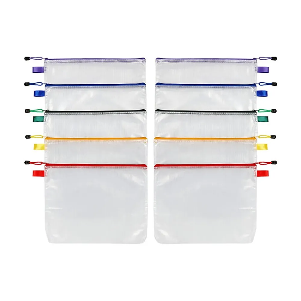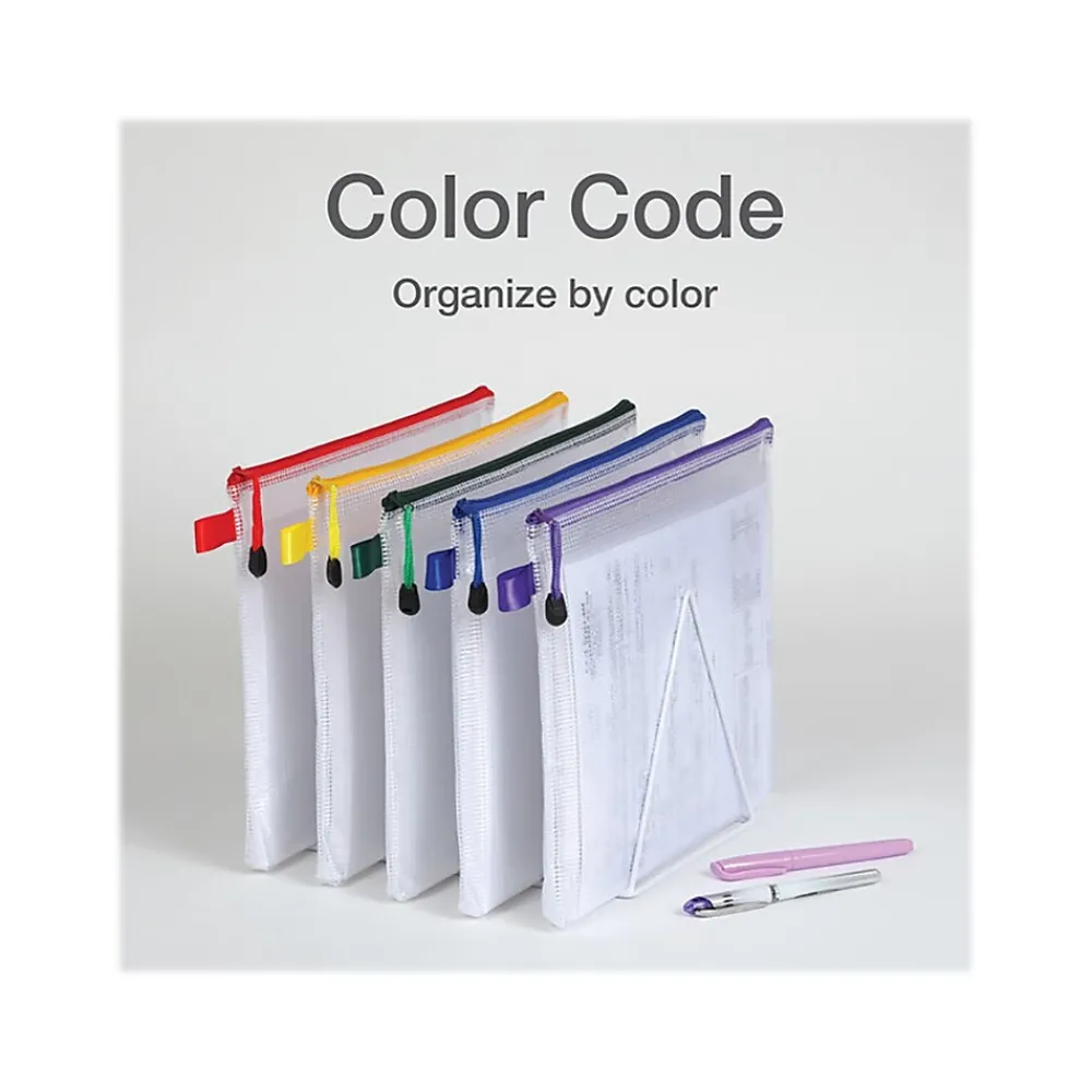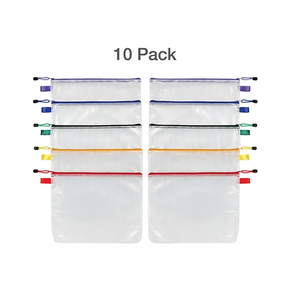 - Made of clear poly with zipper and attachment loop in assorted colors (two red, two yellow, two green, two purple, two blue)
