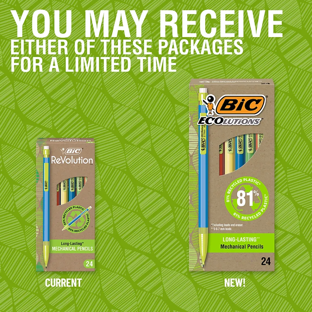 - One package contains 24 bulk pencils in yellow, green, red and blue barrels of the BIC Ecolutions Mechanical Pencils (formerly ReVolution)