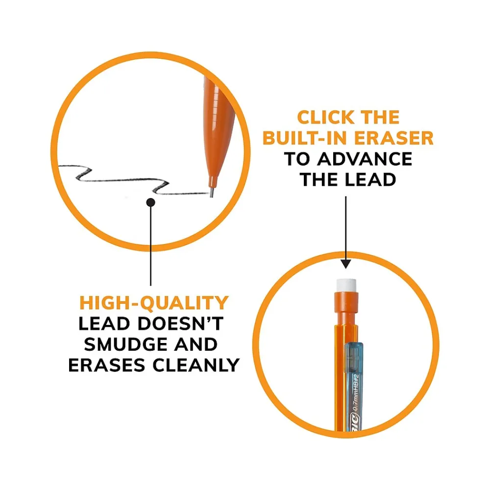 Experience smooth, dark writing with the BIC Xtra-Smooth Bright Edition No. 2 mechanical pencils with erasers. These 0.7mm mechanical pencils have a medium point that’s perfect for a variety of everyday writing activities. The high-quality lead doesn’t smudge and erases cleanly, so your work looks professional and neat. Always ready, the BIC Xtra-Smooth Bright Edition No. 2 pencils are convenient, reliable, and never need sharpening: simply click the built-in eraser to advance the lead. They’re the perfect mechanical pencils for school and come equipped with three pieces of No. 2 lead that’s compatible with most standardized tests. With a clear barrel, these mechanical pencils have a sophisticated, modern look, and their colorful clips easily attach to pockets, notebooks, and more.