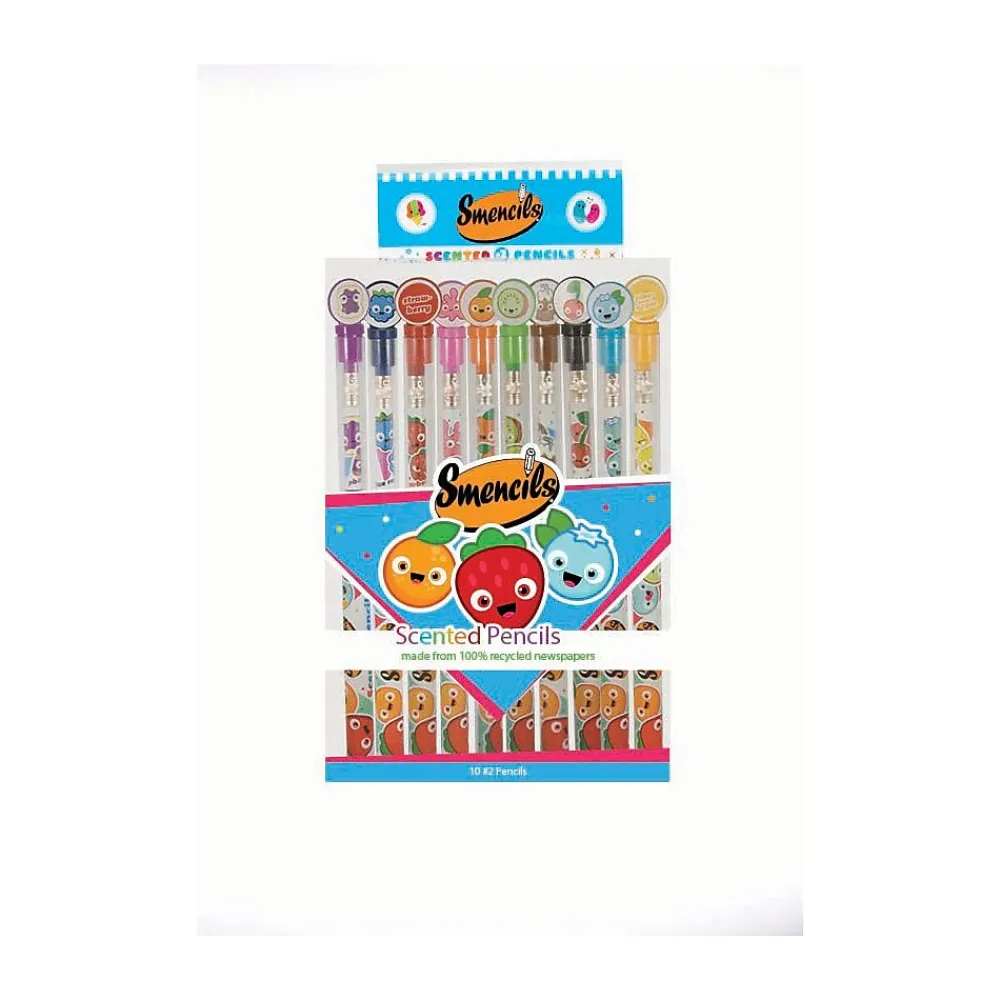 Scentco Inc. Smencils10-pack Scented Pencils. HB#2 Pencils. Recyclable plastic freshness tubesScents Guarnatee to last for up to 2 years. Infused Scented 100% Recycled Newspaper. Scents: Cola, Orange, Lollipop, Cupcake, Sour Apple, Jelly Bean, Jelly Donut, Black Cherry, Rootbeer