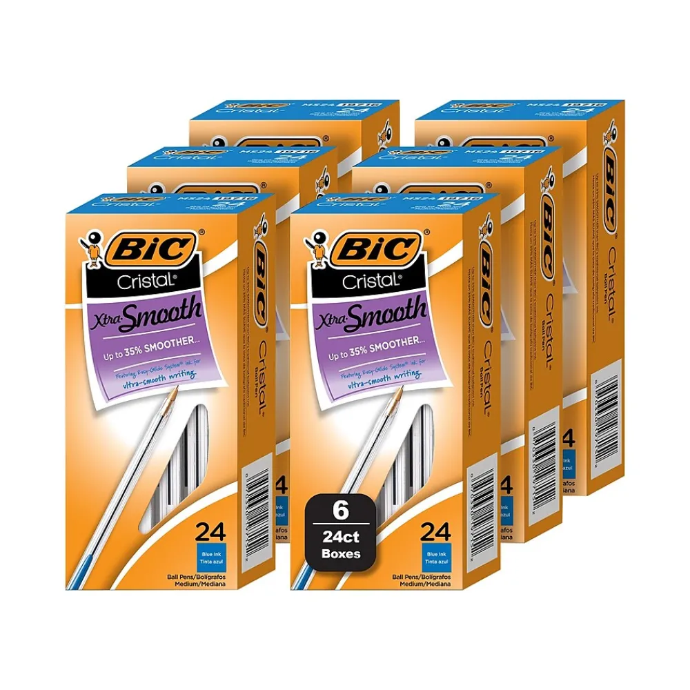 Combine exceptional performance and longevity with the BIC Cristal Xtra Smooth blue ballpoint pen. The flexible 1.0mm medium-point pen delivers crisp, legible lines, making this pen a superb choice for everyday writing activities. The pen minimizes blotting and skipping, as the tungsten carbide ball helps the blue ink spread evenly. The BIC Cristal Xtra Smooth pen has a snug, comfortable grip and a clear hexagonal barrel that lets you see how much ink remains. The matching cap includes a handy clip for easy attachment to pockets or notebooks.