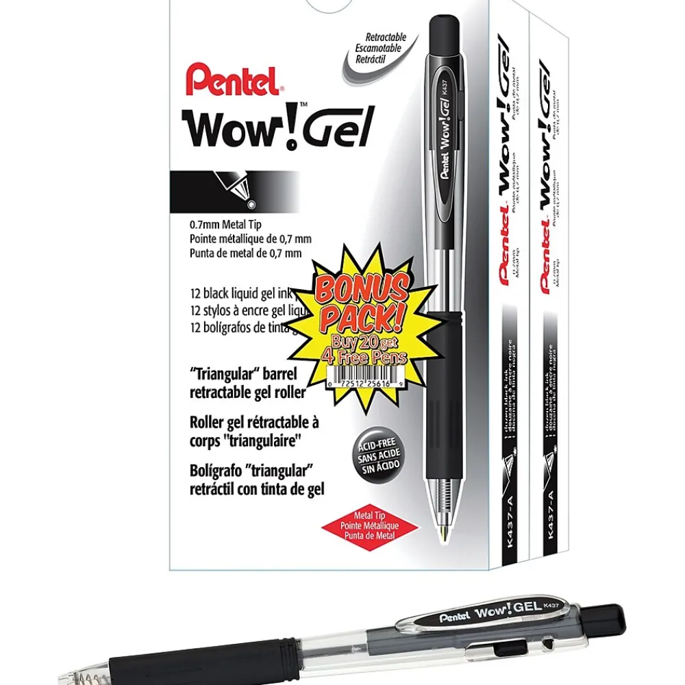 Enjoy a smooth writing experience with the Pentel Wow Gel Pen. This pen comes with a medium tip for bold, legible lines in black. It features a water- and fade-resistant ink which ensures that your copy stays legible for a long time. To enable fatigue-free writing, this medium point pen is equipped with a latex-free, comfortable rubber grip. It has a retractable design with a triangular barrel can be conveniently attached to notepads or pockets with the plastic clip for handy storage.