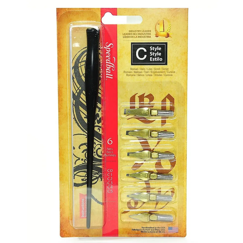 C style pens are ideal for Roman, texts, italic lettering and for accented line drawing, scrolls and scripts. Pen sizes decrease as numbers increase, C-0 being the largest and C-6 the smallest. Pen holders sold separately. Use with Speedball No. 9451 Pen n Holder , General’s Cork Grip Pen Holder , Koh-I-Noor No. 130N Crow Pen Holder , or Speedball Classic Pen Holders . Set of 6 includes one each of C-0, C-1, C-2, C-3, C-4 and C-5 of the C series pen sizes and a pen holder. Set of 4 includes C-1, C -2, C-3 and C-4 of the C series nibs, two fine Hunt nibs for ornamental work and a pen holder.