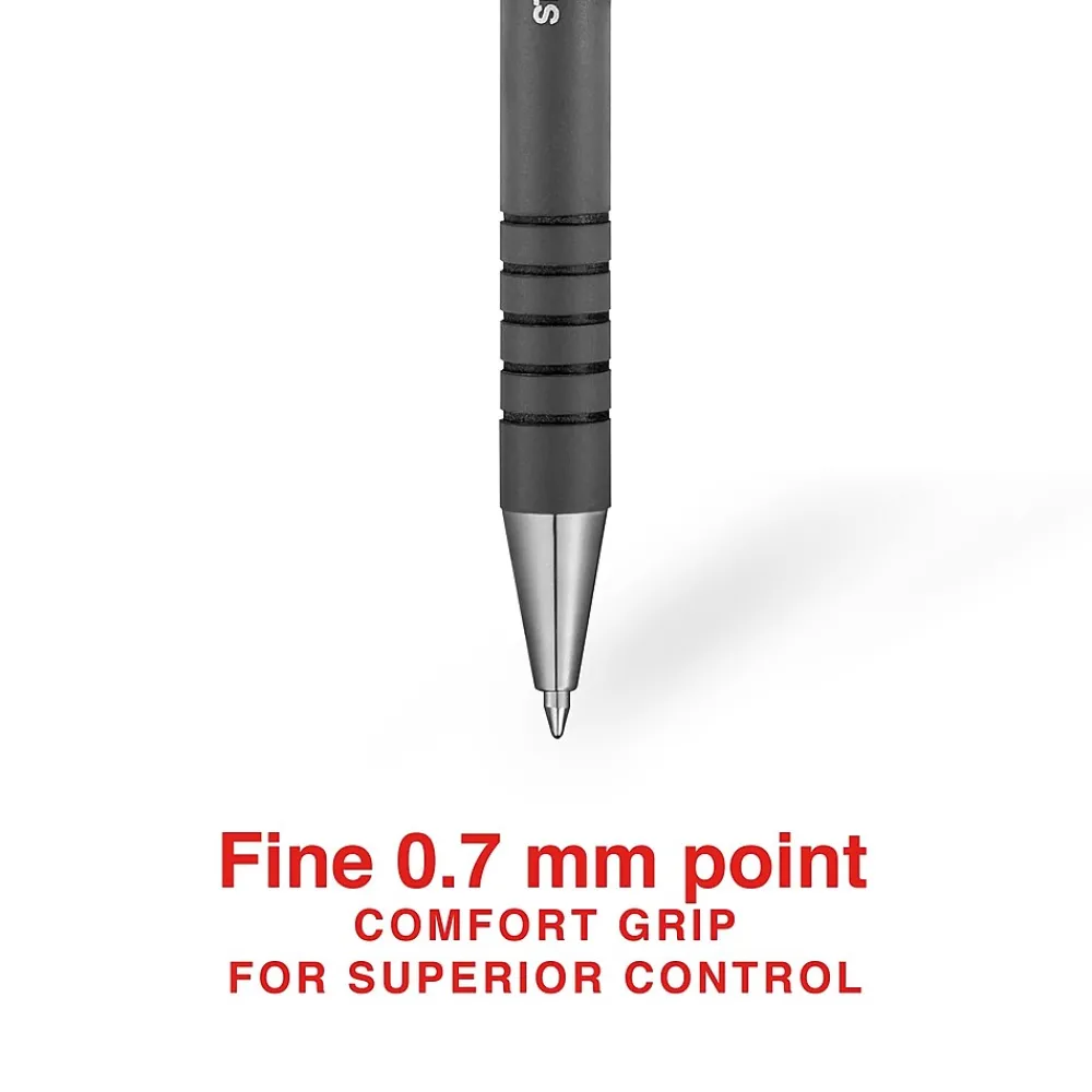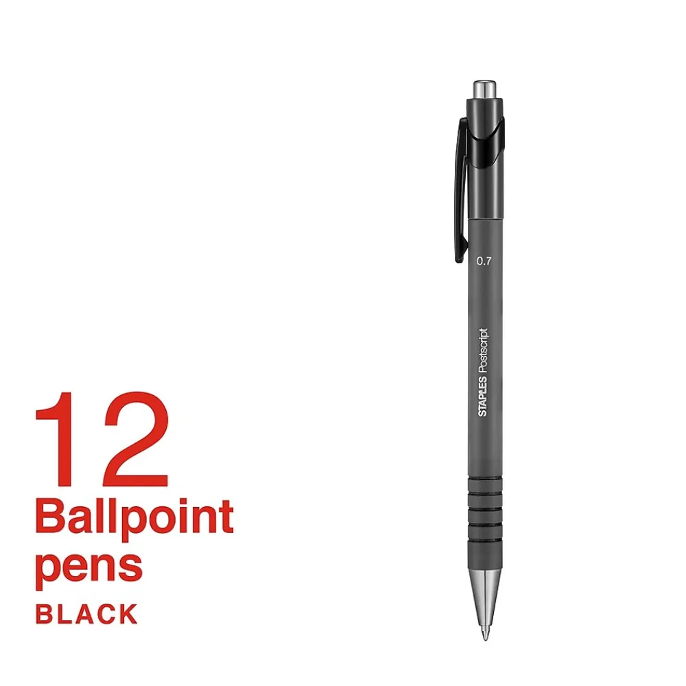 Ensure neat, readable writing with these Staples Postscript ballpoint pens. Smooth-touch barrels and ridged design offer added comfort, while the black ink glides across your paper. Each pen features a handy clip for storing in pockets or attaching to clipboards. The retractable design means there’s no caps to lose, making these Staples Postscript ballpoint pens ideal for use in reception areas, classrooms and waiting rooms.