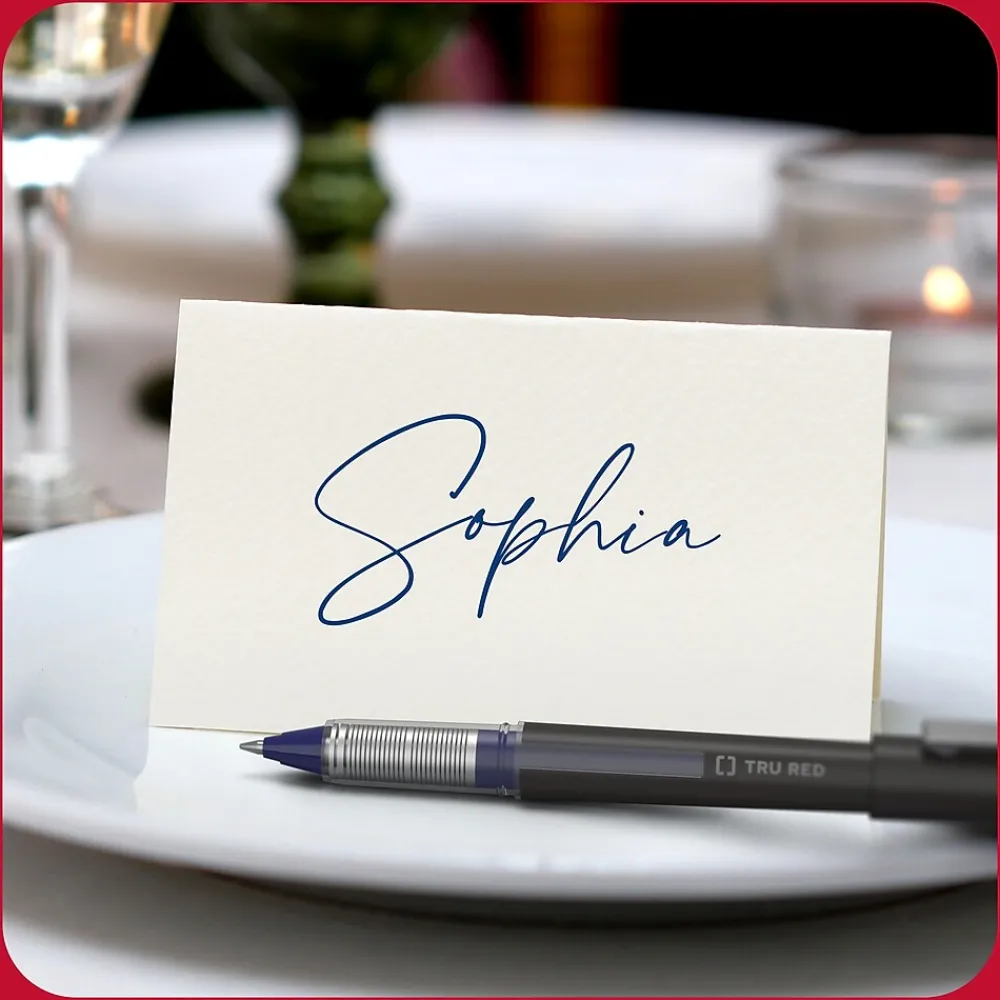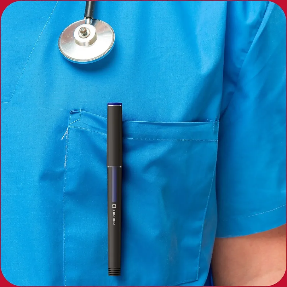 Fill your desk drawer with this ample supply of blue rollerball pens. The matte finish and carbon steel clip provide a professional look, while the airplane-safe construction lets you bring the pen inside pressurized cabins without leaks. Create crisp, clear lines using the 0.5mm conical tip. This TRU RED 0.5mm blue rollerball pen has a transparent window so you can see the ink level.