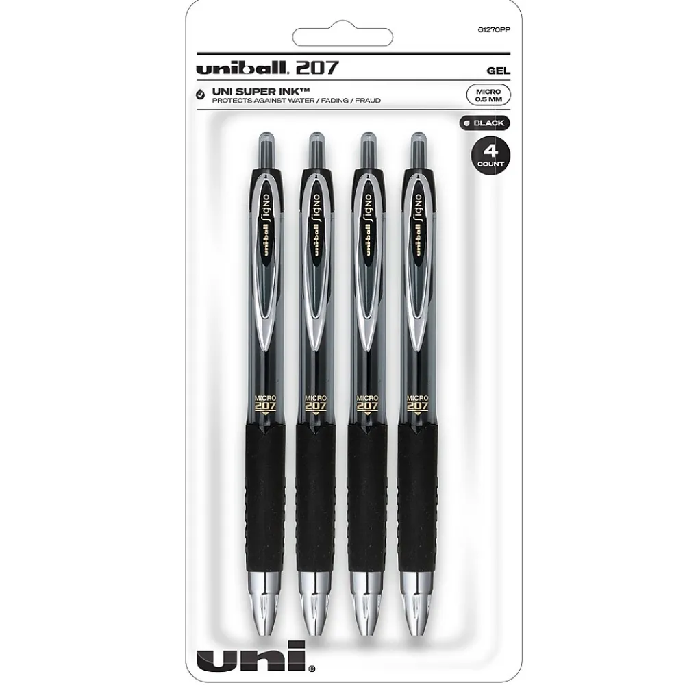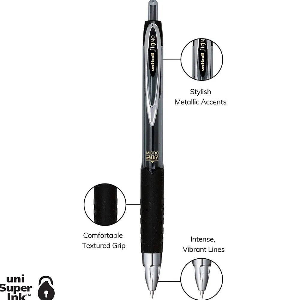 Take notes with sharp precision using these uni-ball 207 micro-point retractable gel-ink pens. The cushy grip gives you solid control while providing comfort during extended writing sessions, and the retractable design keeps your purse, pocket or desk drawer safe from unwanted stains and messes. These uni-ball 207 retractable gel-ink pens feature quick-drying ink so your writing stays crisp and clean.