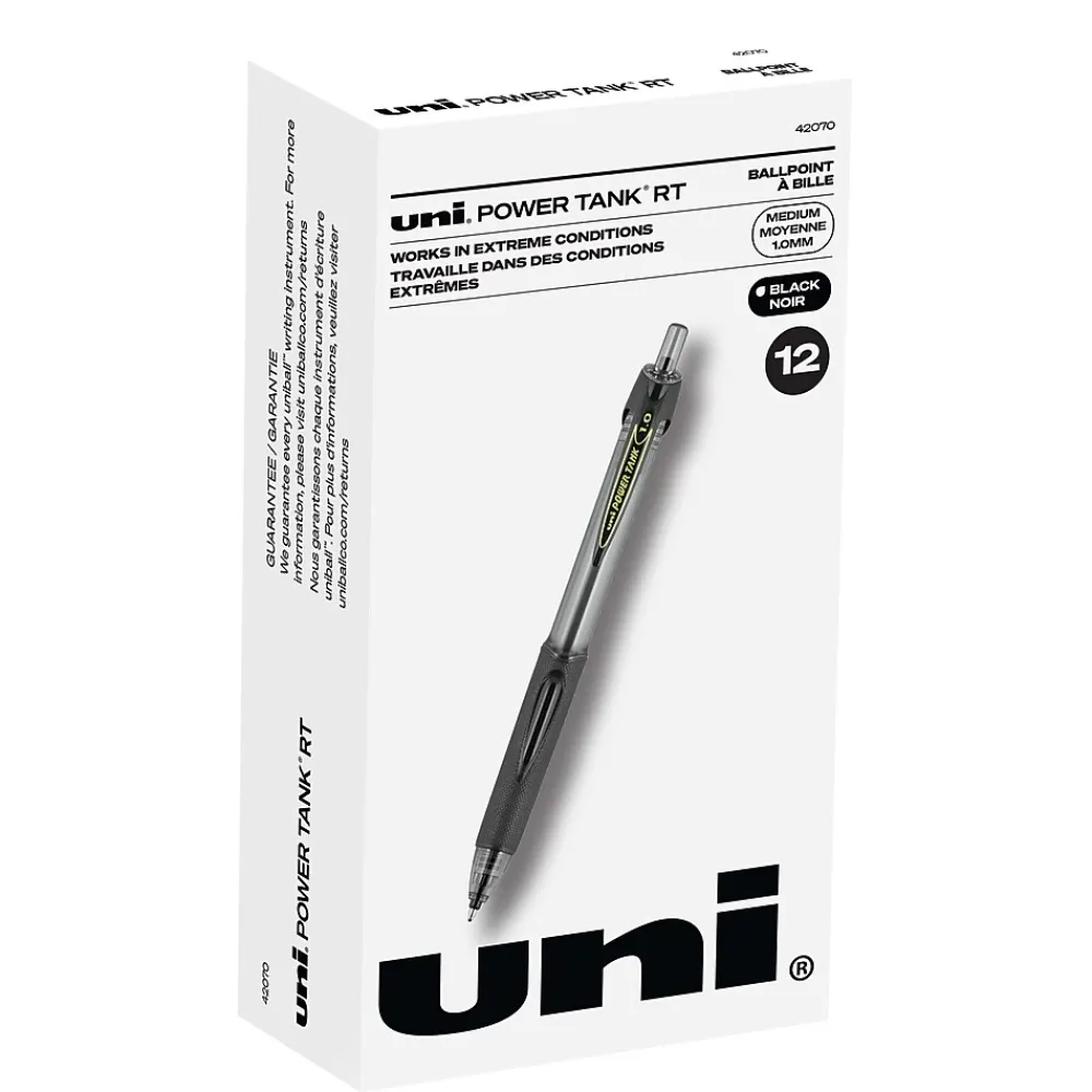 Write effectively in the toughest conditions with Power Tank Retractable Ballpoint Pens from uniball featuring a 1.0mm medium point. Designed to perform optimally in extreme conditions, the pens feature a pressurized ink cartridge that offers fast and clean writing even on damp surfaces, in bitterly cold conditions or at unusual angles, including upside down. The refillable ballpoint pens come with a textured rubber grip that encourages greater writing comfort. uni Super Inkâ„¢ has pigmented particles that create an Incredible bond with the paper, helping you create fraud, fade and water resistant documents even in harsh environments. The 1.0mm medium point offers bold strokes with a rich color payoff for clear writing. When you need a rugged writing tool, this refillable ballpoint click pen is the best choice in any hemisphere.
