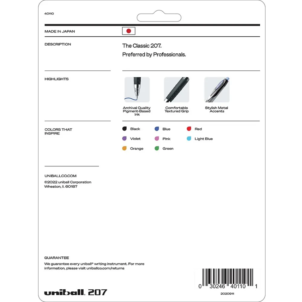 Stock your office, home or classroom with 207 Retractable Gel Pens from uniball featuring a 0.7mm medium point with a stainless steel tip that resists bending and breaking. Even-flowing, pigment-based gel ink delivers a smooth writing experience for intense, vibrant lines, ensuring that every mark is brilliantly communicated. Use these retractable gel pens for everyday writing tasks, check signing and all of your important signatures, trusting its quick-drying uni Super Ink. Innovative uni Super Ink technology effectively entraps the gel ink into the paper, producing fraud, fade and water-resistant documents that resist check washing or bleaching. The 0.7mm medium point strikes the perfect balance between bold and detailed lines. A textured grip offers greater comfort and control as you continue writing, while a translucent ink window indicates the level of gel ink remaining, so you don’t run out unexpectedly. The sleek design of the 207 with modern metal accents gives the retractable gel pen a stylish touch.