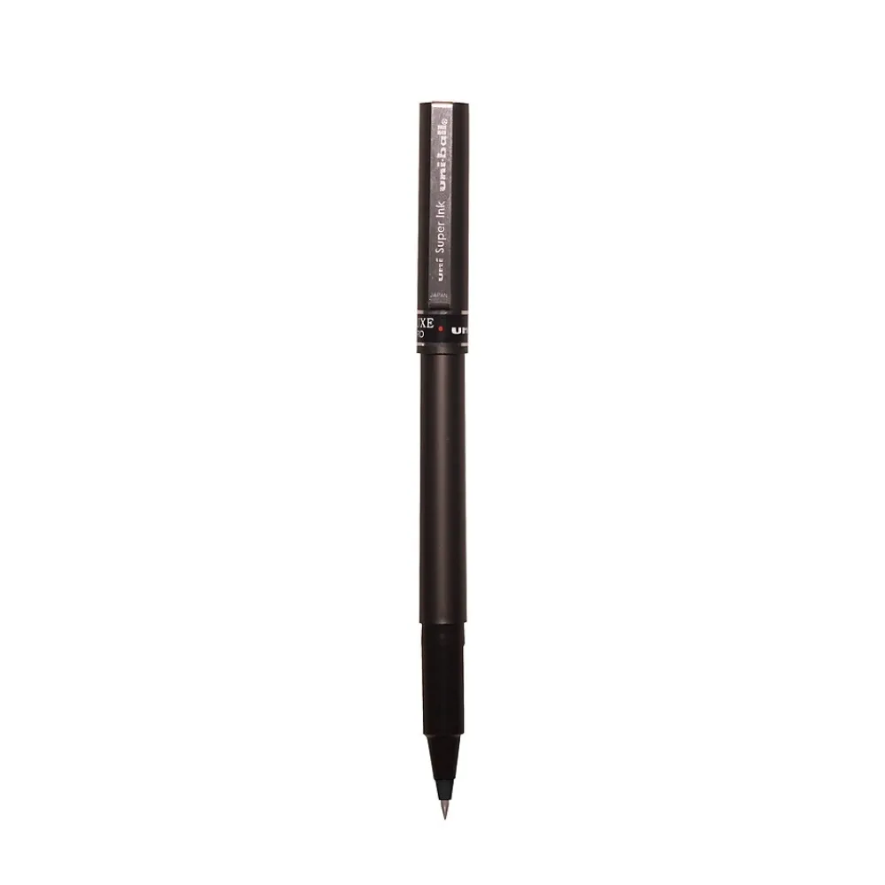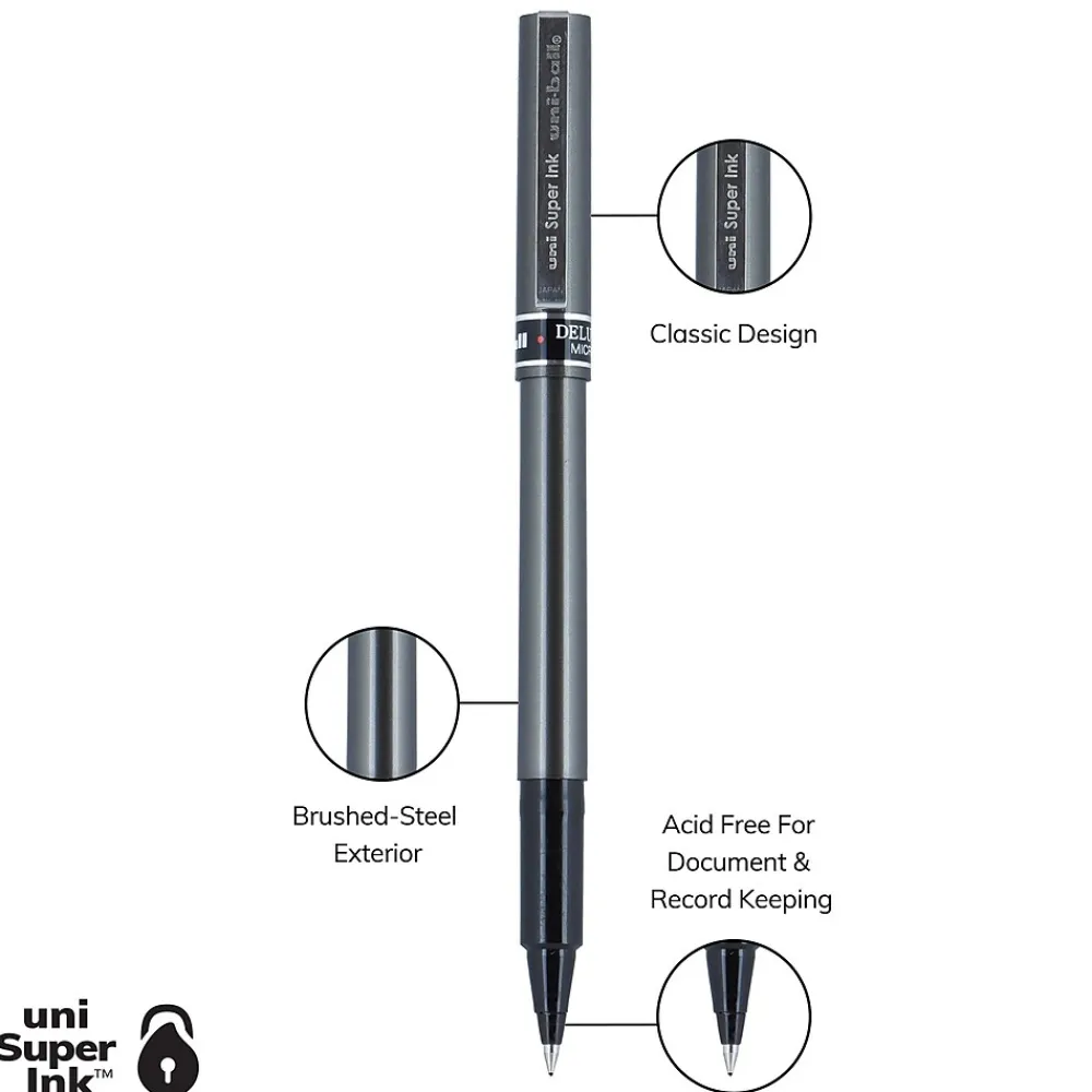 Introduce sophisticated style to your everyday writing with Deluxe Rollerball Stick Pens from uniball featuring a strong, long lasting 0.5mm micro tip. Even-flowing, acid-free liquid ink delivers a smooth writing experience for intense, vibrant lines. Micro point pens produce neat and crisp strokes for intricate writing, making it easy to create super fine details in your drawings and diagrams. Capped roller pens are useful for a variety of tasks from note taking and list making to signing checks and legal documents. Innovative uni Super Ink technology forms a strong bond with the paper, protecting from water, fading and fraud. Up your writing instrument sophistication with the matte black, brushed steel barrel of the Deluxe capped rollerball pens.