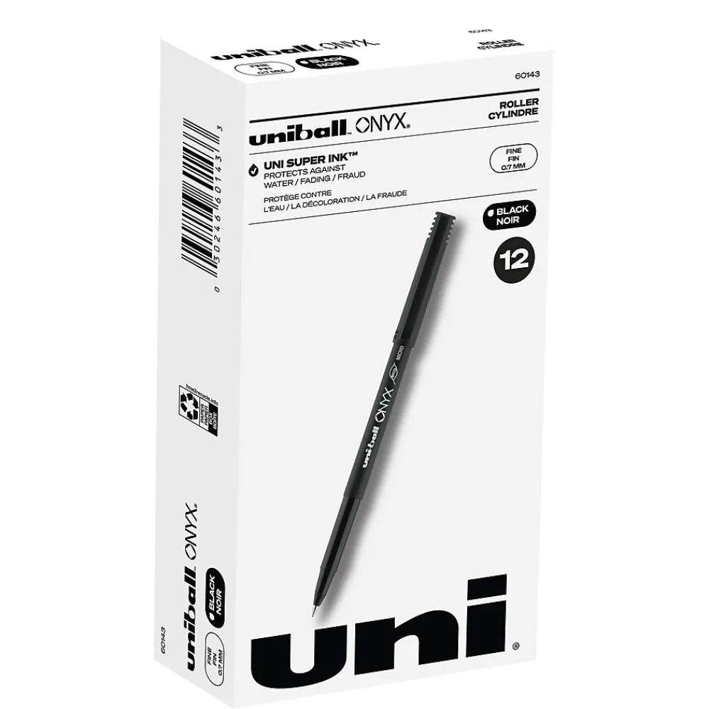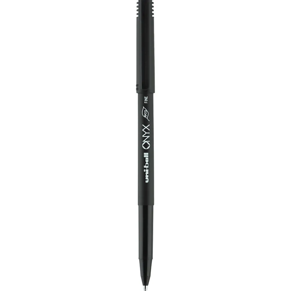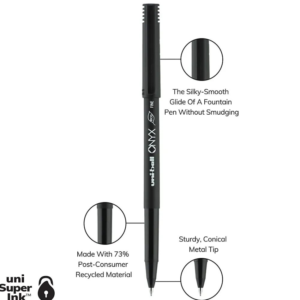 Stock your office, home or classroom with Onyx Rollerball Stick Pens from uniball featuring a strong, long lasting 0.7mm fine tip. This rollerball pen delivers the silky-smooth glide of a fountain pen without smudging for effortless writing. Fine point pens deliver crisp lines with unparalleled definition, making it easy to create super fine details in your drawings and diagrams. Capped roller pens are useful for a variety of tasks from note taking to signing checks and legal documents to uniquely embellishing fun and creative writing projects. Innovative uni Super Ink technology forms a strong bond with the paper, protecting from water, fading and fraud. A great economic and environmental choice as this super sleek fine point roller pen is made from 73% post-consumer recycled material.