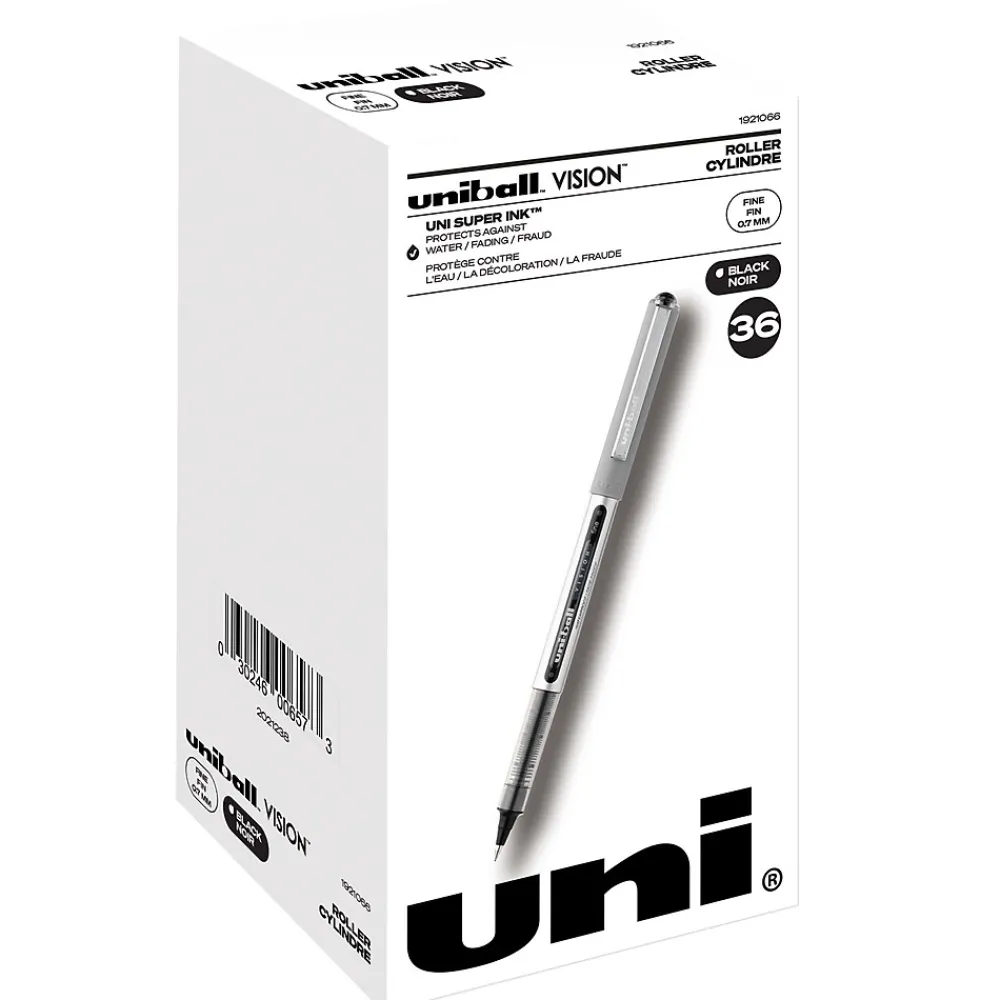 Make your everyday writing easy with the effortless and dependable performance of Vision Rollerball Pens from uniball available in multiple tip sizes. Capped roller pens deliver an even liquid ink lay-down for reliably smooth, vivid lines and a rich color for improved clarity and readability. Great for all writing tasks from taking notes to record keeping with archival quality, acid free roller ink. Innovative uni Super Ink technology forms an indestructible bond with the paper to minimize the risk of check washing or document fraud, while also protecting from water and fading. The exclusive Uni-Flow Ink System ensures a consistent, delightfully fluid writing experience, and a translucent window ensures that you don’t run out of ink unexpectedly. Enjoy beautiful clean lines and give all of your ideas a burst of brilliant color with this classic style rollerball pen.
