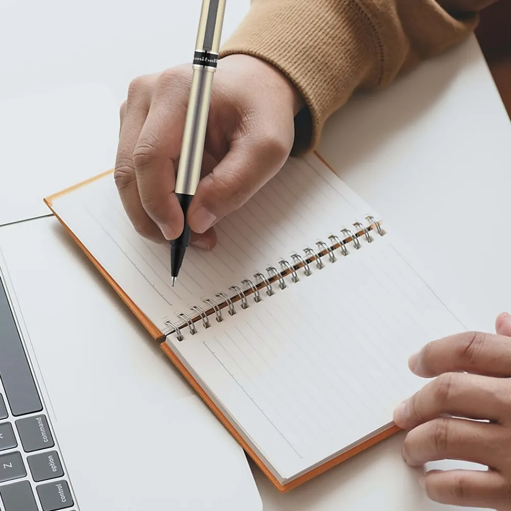 Fill-out documentation, create small labels, and work on other writing tasks with these fine-point rollerball pens. Specially formulated to trap ink within pages, these pens prevent check washing and other unauthorized alterations to documents. These uni-ball Deluxe blue pens have archival-quality ink, so you can easily preserve important papers, while the brushed-steel design provides a sleek and sophisticated look and feel.