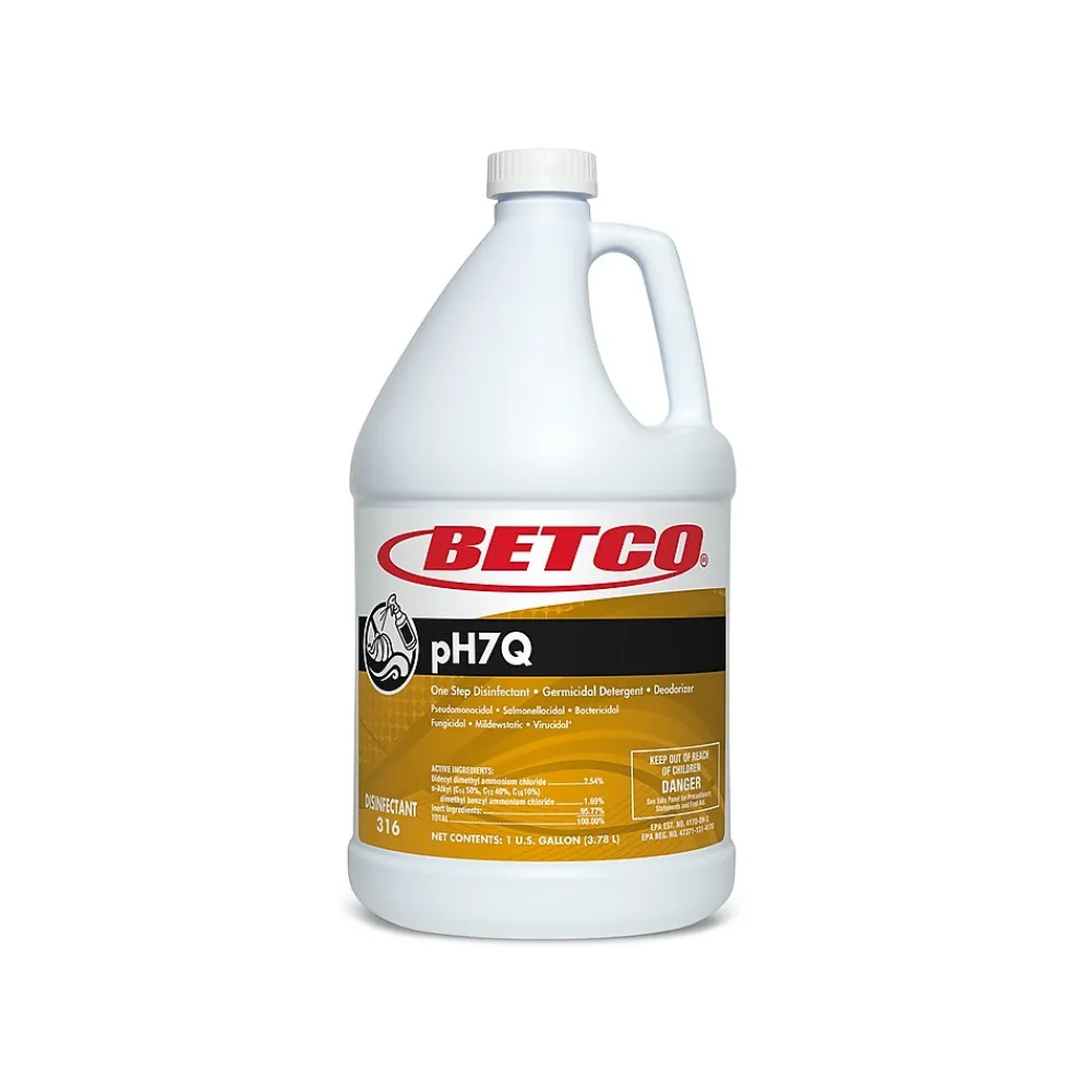 Betco pH7Q multipurpose germicidal detergent and deodorant disinfects, cleans, and deodorizes in one labor-saving step. Recommended for use in hospitals, nursing homes, schools/colleges, commercial and industrial institutions. Neutral pH formula is perfect for damp-mopping highly polished floors and will never dull, haze, or leave a film.