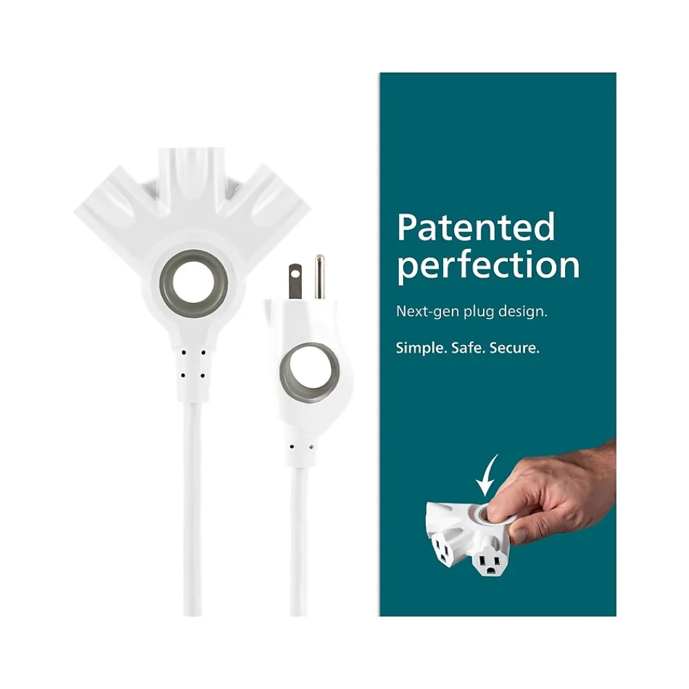 Get a grip on your electronics with the Philips EZ Grip three-outlet 8′ indoor/outdoor extension cord. Featuring three grounded outlets, this extension cord extends the output of any grounded AC outlet. The advanced design of the EZ Grip extension cord includes built-in ergonomic handles, making it easy to properly and safely attach and disconnect electronics. Use this versatile cord outdoors for power tools, patio lights, or yard decorations. This cord is also rated for indoor use to power your electronics, appliances, and mobile devices. Whether in the home, garage, workshop, or office, the dynamic 8′ range of this cord makes extending the reach of your outlet effortless. This heavy-duty outlet extender is constructed of 16-gauge cable housed in a durable PVC insulation and jacket that makes it strong enough for the toughest jobs but pliable enough to easily fully extend. The high-visibility white finish of this cord allows it to stand out from existing cords and cables.