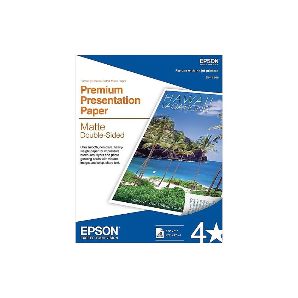 Elevate business marketing strategies by printing impressive brochures and flyers on this matte presentation paper. The 9-mil thickness supports neat double-sided printing that’s ideal for creative projects, and the bright white surface resists ink bleeding for sharp, vivid graphics. Add this 50-sheet pack of Epson presentation paper to printing supplies for quick reloading on compatible inkjet printers.