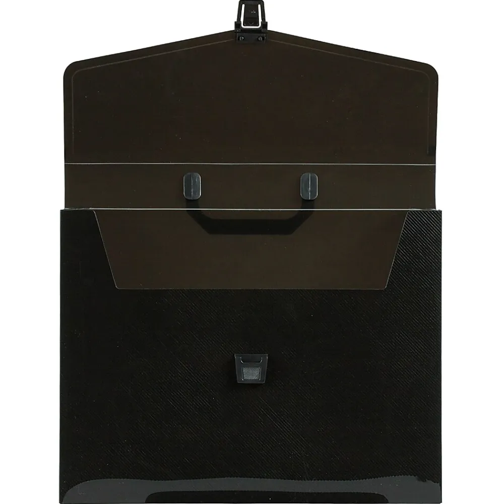 JAM PaperĀ® Black Plastic Portfolio Briefcase with Handles measures 12 x 9.5 x 1.5 inches in size and is made out of smooth, durable poly plastic. Featuring a solid black color, this case will appear professional in any office or academic setting and will keep the contents inside of it hidden from sight. To make carrying it from place to place simple and easy, this portfolio has a black plastic handle. It opens up in the front with a vflap and closes with a black plastic closure. This case is sold individually. Use it to store, protect, and carry your important documents. Whether you need to carry files to your office, spreadsheets to that next meeting, or advertising materials to a sales call, this portfolio will help you get the job done.