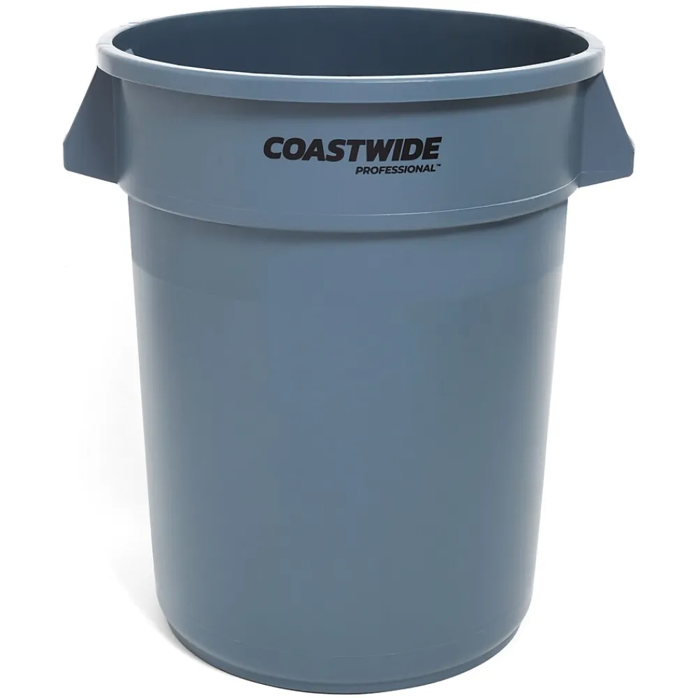 Make maintenance tasks simple with this durable 32-gallon trash container. Strong polyethylene construction handles heavier trash, making this waste receptacle ideal for use in break rooms and restrooms, while durable molded handles are easy to lift for quick emptying. This Coastwide Professional™ round gray trash container has a double ribbed base for extra reinforcement, and the nesting design is easy to stack when empty.