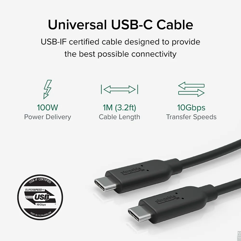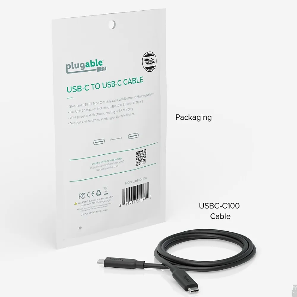 The Plugable USBC-C100 USB 3.1 type-C USB-C to USB-C cable ensures the best connectivity. This 3.3′ cable supports up to 10 Gbps data transfer over USB 3.1 Gen2 hosts and devices. The super speed cable has gold plated connectors with a nickel-plated shell and 26-AWG coaxial cable, which provides maximum EMI shielding and excellent data transmission integrity. This USB-IF certified USB-C to USB-C cable works well with USB-C computers, phones, tablets, chargers, docking stations, accessories and more. The cable is compatible with all USB generations, including USB 1.1, 2.0, 3.0 and USB 3.1.