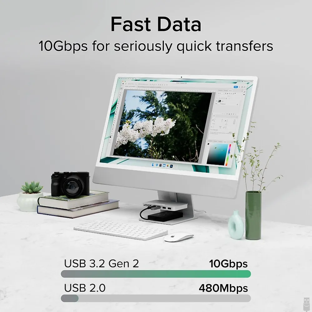 - 6-in-1 Right Up Front – Quit fumbling around back there. This iMac USB hub brings easy access to 6 of the most commonly used ports, 1x USB-C (10Gbps), 1x USB-A (10Gbps), 2x USB 2.0, and SD and Micro SD card readers, all suspended beneath your screen for quick connections