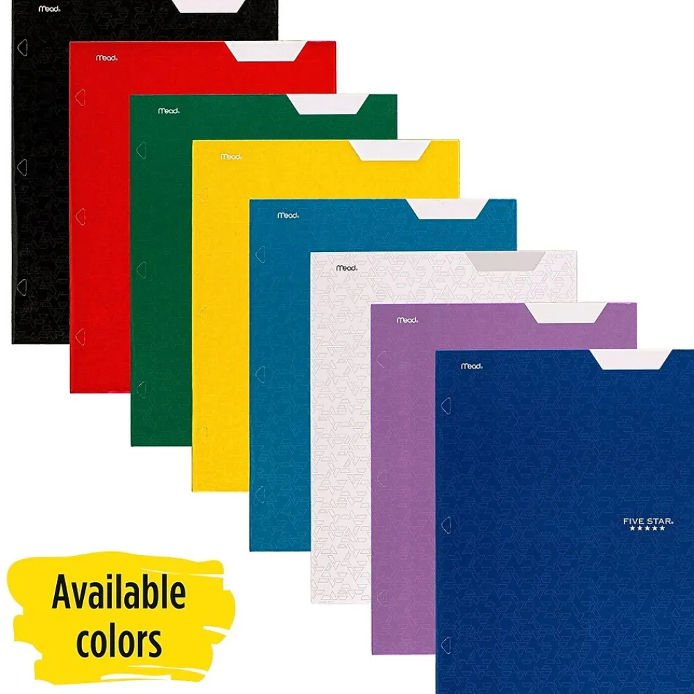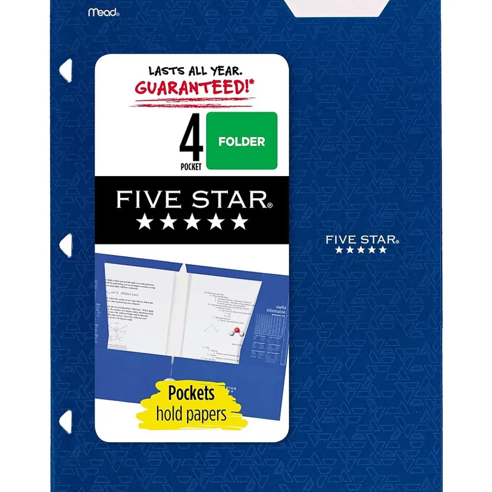 LASTS ALL YEAR. GUARANTEED!* This Five Star folder makes it easy to keep papers organized for multiple classes. Stay organized by writing the subject name on the writable label, which lets you quickly identify the class. Inside, vertical and horizontal pockets store 8 1/2″ x 11″ loose sheets and handouts. Useful information is printed inside the folder, including the periodic table, rulers and conversion charts for quick reference. Your papers stay protected from accidental spills with the durable, water-resistant laminated paper surface. This folder is 3-hole punched, so you can easily store it inside your favorite binder. Available in Black, White, Pacific Blue, Fire Red, Tidewater Blue, Amethyst Purple, Harvest Yellow, Forest Green. Color chosen for you.