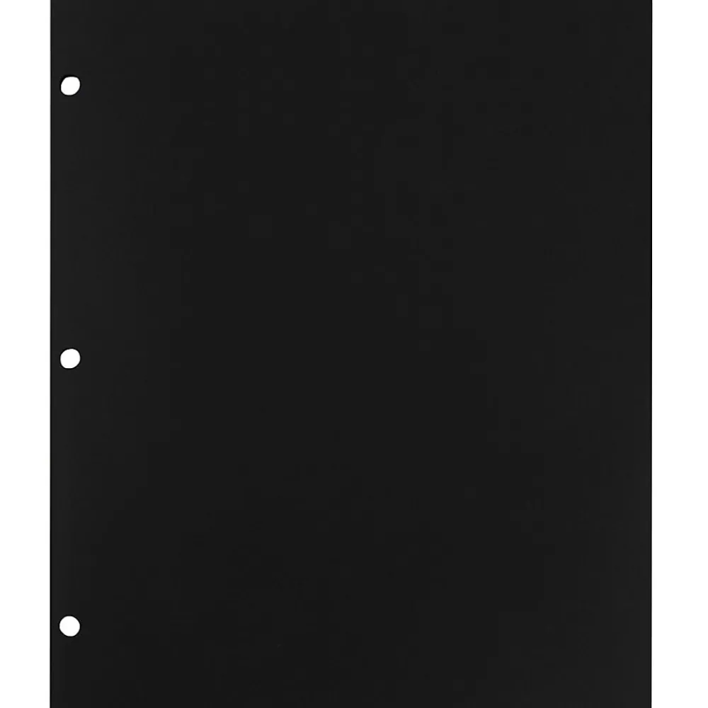 JAM PaperĀ® Black Plastic Two Pocket 3 Hole Punched Presentation School Folders are 9in x 12 inches in size and are made out of heavy duty, pliable plastic. In this large pack, a total of 108 folders is included. Each of these folders features two pockets on the inside. The right side pocket features two slots for business card slots and other small documents. Each folder has three holes in a vertical row on the left the side for placing and securing them into binders. These folders have a jet black color that gives them a versatile edge. Use them in any school or office setting to organize documents and to keep them safe from damage.