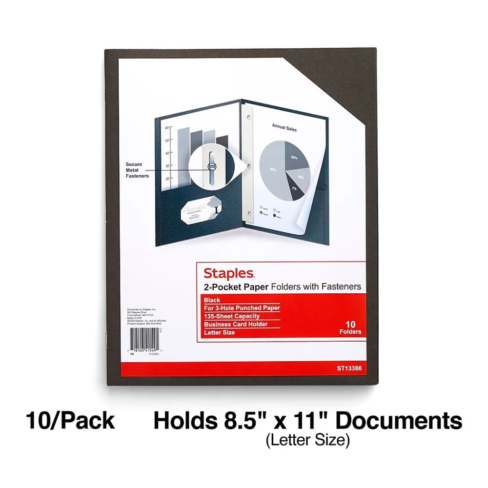 Be prepared at appointments, meetings, and classes with these black folders. These folders come in leatherette-embossed standard-grade stock and include sturdy metal prongs, letting it hold contents securely, while the two interior pockets provide additional storage for unpunched papers. These Staples two-pocket folders come in black and offer a die-cut business card holder, letting you add an extra touch of professionalism to it.