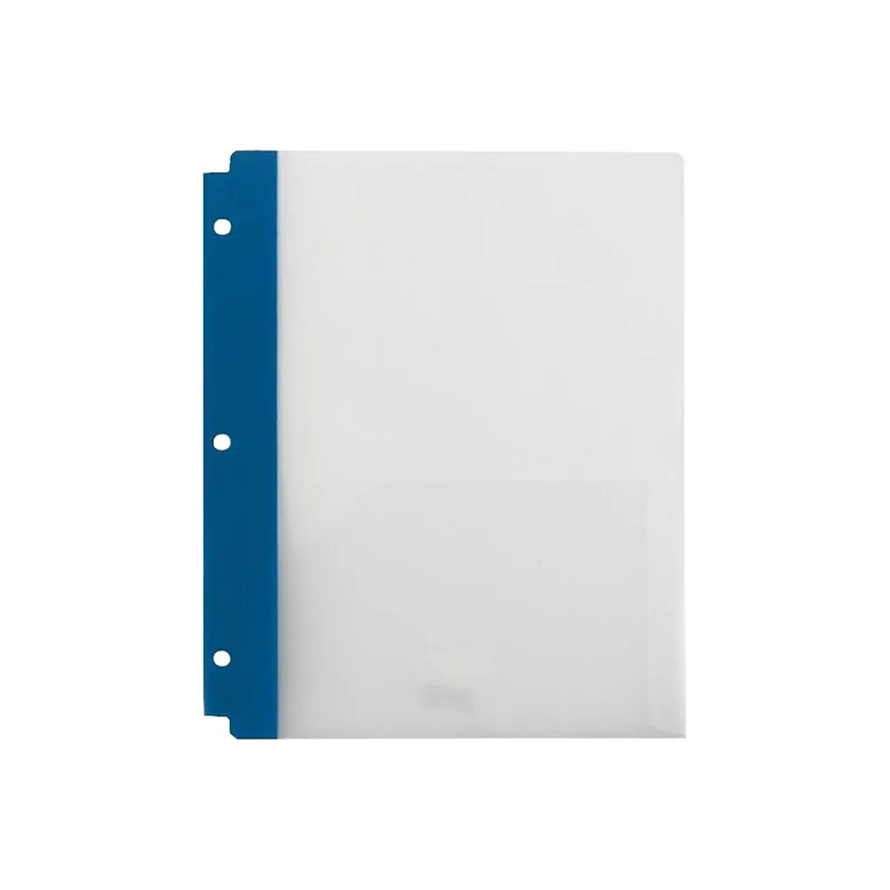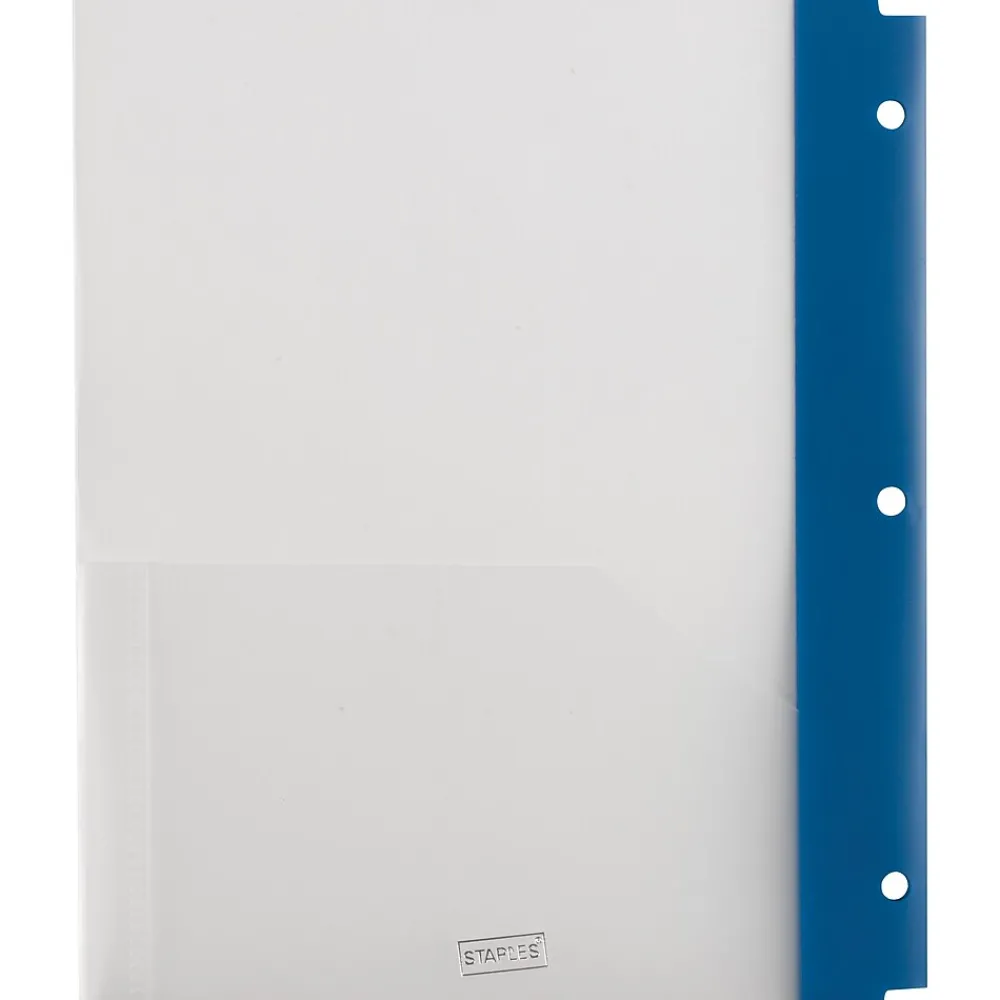 The Staples 2-pocket poly folder with a frosted navy spine is made of a durable poly material to protect your documents while maintaining its shape.