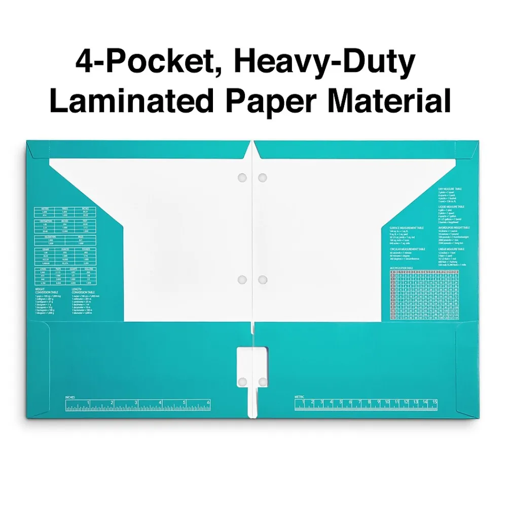 The 4-pocket folder comes in teal and includes a weight and length conversion table, printed ruler in inches and metric with and has 2 horizontal and 2 vertical pockets, making it perfect for carrying presentation materials or everyday reports.