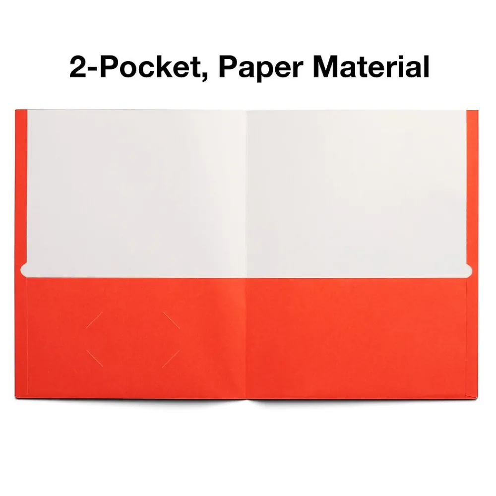 Organize documents by using these orange two pocket folders. Each folder is manufactured with economy-grade paper material to provide enhanced value, while the two pockets can hold up to 25 sheets of paper each without trouble for a total of 50 sheets. These Staples school two-pocket folders are available in several colors, making them ideal for color-coding documents for easy retrieval, and a business card holder lets you add professional personalization.