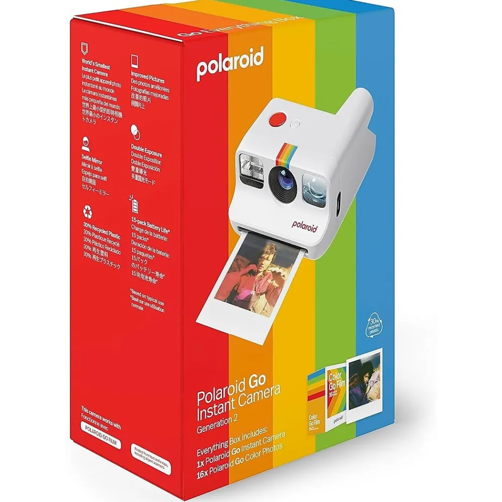 Capture real life on the Go. Our most portable, wearable, take anywhere-able Polaroid Go Generation 2 instant camera has been upgraded with a large aperture range, precise light sensor, and on-point-exposure settings to make your pictures even better. It’s really small (the smallest instant camera in the world) but comes with big creative potential featuring a selfie mirror, self-timer, double exposure, and can be paired with its own teeny tiny color filters. All in the classic design, and now made with 30% recycled materials. Includes a Polaroid Color Go Film Double Pack for 16 color instant photographs with white frames. Compatible with Polaroid Go film, our smallest Polaroid instant film format.