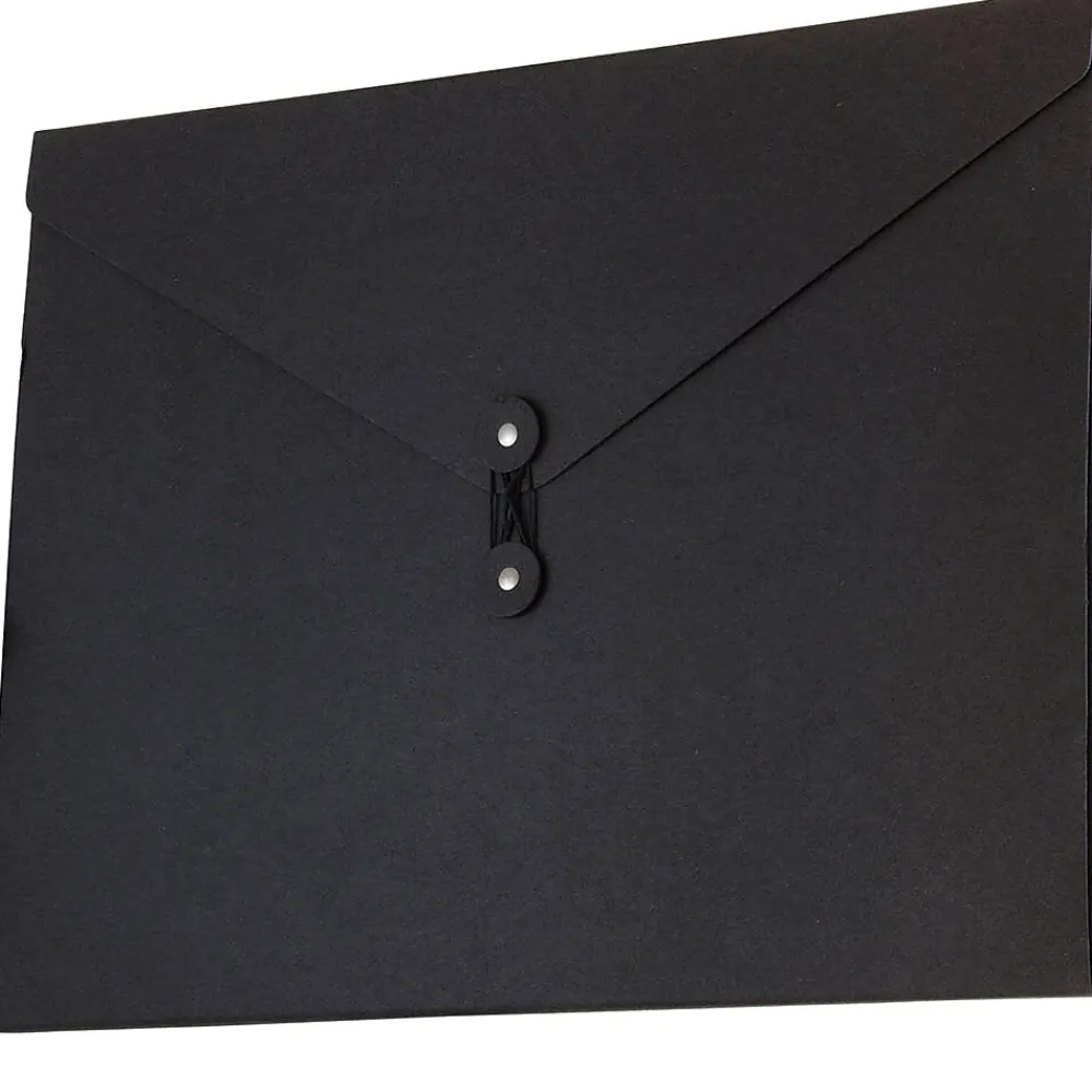 JAM PaperĀ® Black Jumbo Recycled Kraft Portfolio with Button and String Closure measures 12.5 x 16.5 x 0.5 inches in size and is made out of durable, smooth, earth friendly, 100% recycled chipboard! This portfolio is sold individually and features a professional jet black color that looks great in any work space or office! For easy opening and secure closing, this portfolio has a vflap and a reliable two-button and string-tie closure. Both buttons of this closure match the surface of the case and the string is also jet black. The large size of this portfolio makes it excellent for carrying all of your important documents, projects, and small office supplies safely from place to place!