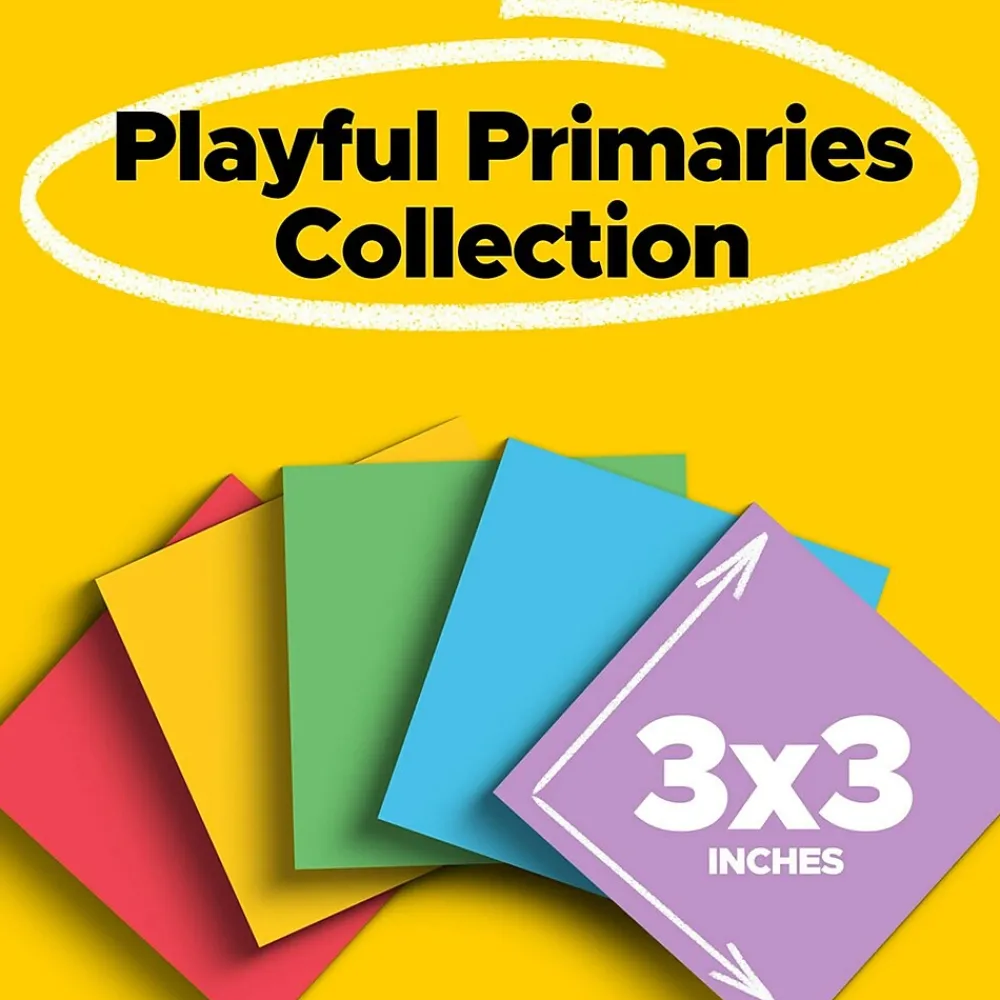 Add joy to the day alongside celebrated rainbow hues from the Playful Primaries collection. Whether jotting down your daily to-do’s, brainstorming big ideas, studying or setting reminders, colors and ideas are always brighter together. These sticky notes feature 2X the sticking power. They also stick and re-stick – allowing you to move your notes with you throughout your day. They’re ideal for walls, doors, windows and other vertical surfaces, and like all Post-it Notes, they stick securely yet remove cleanly without damage. Keep your ideas across your notebooks, classroom books, calendars or other documents. No tape or tacks are needed with adhesive notes, saving you money and time on office products or school supplies. A great memo pad, these are ideal for using for notes or reminders to yourself or others. Post-it Super Sticky Notes are the perfect solution for shopping lists, reminders, notes on computer screens, time tracking, to-do lists, marking cables, color-coding documents, reminding kids to do chores, storyboarding, scratch paper and agile processing. Each notes sheet is approximately 3 in. x 3 in., with 45 sheets per pad and 5 sticky note pads per pack. These colorful sticky notes include colors from the Playful Primaries collection including red, yellow, green, blue and purple. All Post-it Notes are sourced from certified, renewable and responsibly managed forests, and all Post-it Notes are recyclable, so you can recycle them when they are no longer needed.