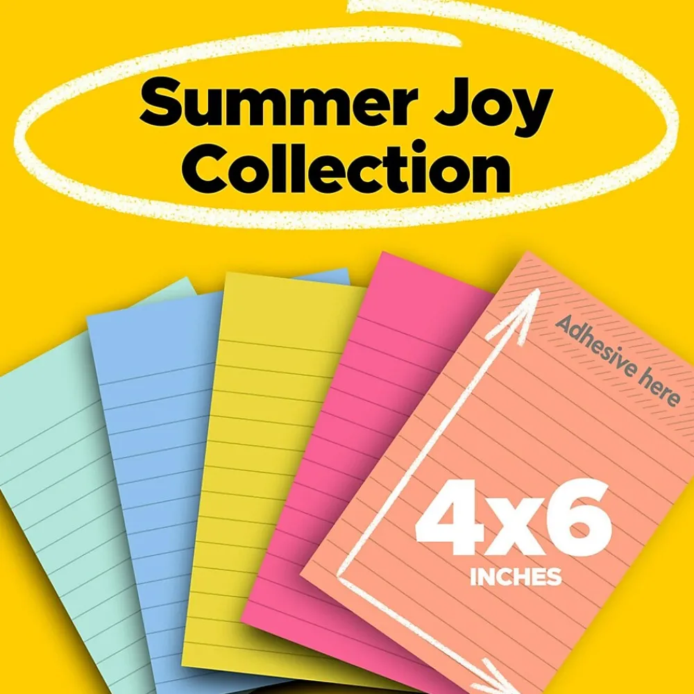 Post-it Super Sticky Notes in 4 in x 6 in feature 2x the sticking power. Use for lists or longer notes on doors, windows or walls. Unique adhesive reliably sticks and re-sticks so your message can stay front and center. Move your notes with you throughout the day. Post-it Super Sticky Notes are recyclable and the paper in Post-it Super Sticky Notes is sourced from certified, renewable and responsibly managed forests. Share the warmth of the summer sunshine memories all year long with the Summer Joy collection. 5 Pads/Pack, 90 Sheets/Pad.