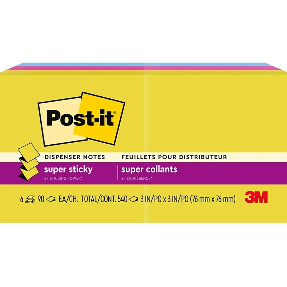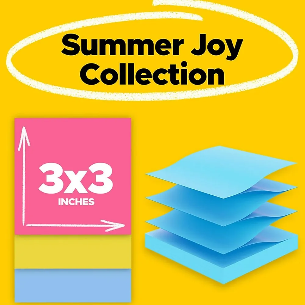 Share the warmth of the summer sunshine memories all year long with the Summer Joy collection. Whether jotting down your daily to-do’s, brainstorming big ideas, studying or setting reminders, colors and ideas are always brighter together. These sticky notes feature 2X the sticking power and are accordion-style notes that work to refill Post-it Note Dispensers. They also stick and re-stick – allowing you to move your notes with you throughout your day. They’re ideal for walls, doors, windows and other vertical surfaces, and like all Post-it Notes, they stick securely yet remove cleanly without damage. Keep your ideas across your notebooks, classroom books, calendars or other documents. No tape or tacks are needed with adhesive notes, saving you money and time on office products or school supplies. A great memo pad, these are ideal for using for notes or reminders to yourself or others. Post-it Super Sticky Notes are the perfect solution for shopping lists, reminders, notes on computer screens, time tracking, to-do lists, marking cables, color-coding documents, reminding kids to do chores, storyboarding, scratch paper and agile processing. Each notes sheet is approximately 3 in. x 3 in., with 90 sheets per pad and 6 sticky note pads per pack. These colorful sticky notes include colors from the Summer Joy collection including yellow, pink and blue. All Post-it Notes are sourced from certified, renewable and responsibly managed forests, and all Post-it Notes are recyclable, so you can recycle them when they are no longer needed.