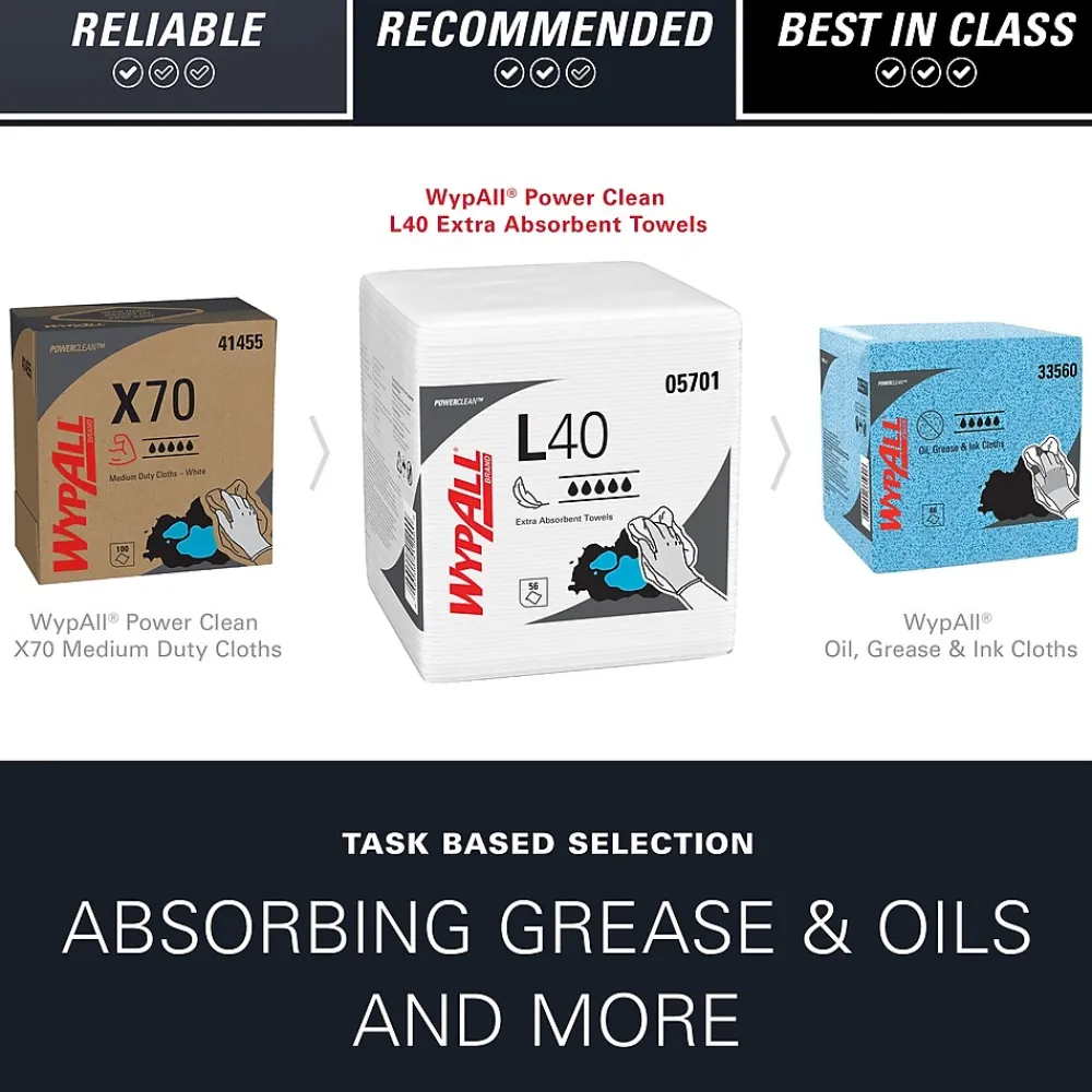 - 56 Sheets/Pack; 18 Packs of WypAll® PowerClean™ L40 Extra Absorbent Towels/Case; 1,008 Sheets/Case; White; Quarterfold; Limited Use Towels