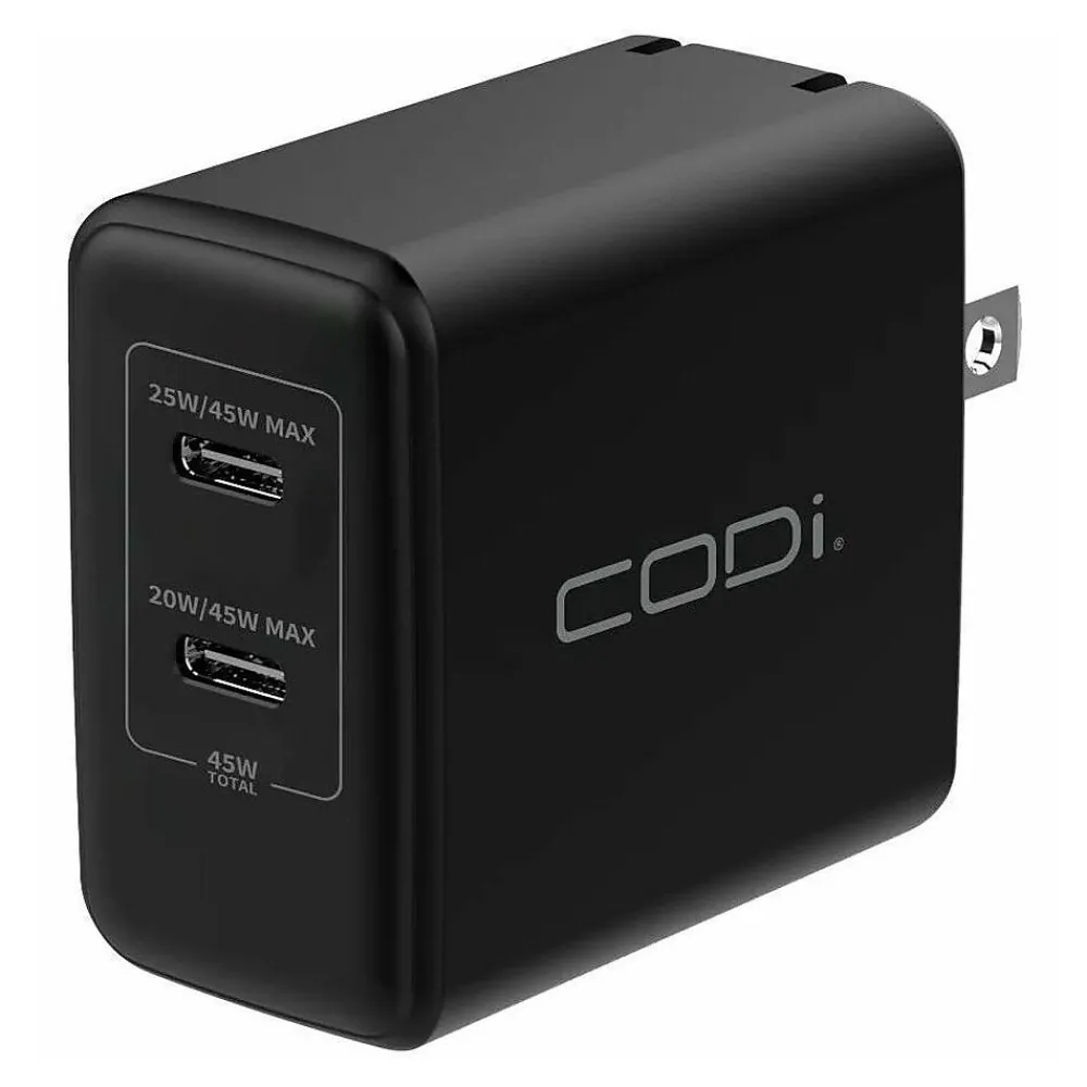 - The 45W Wall Charger with 2 USB-C Charging Ports by CODi is a charger designed for wired charging. Provides fast and efficient charging for devices with USB-C ports, such as smartphones, tablets, and laptops