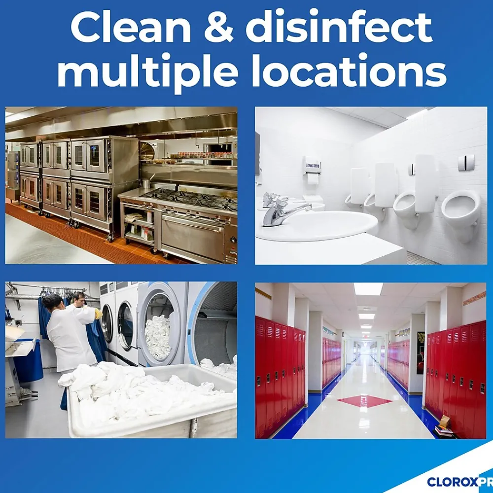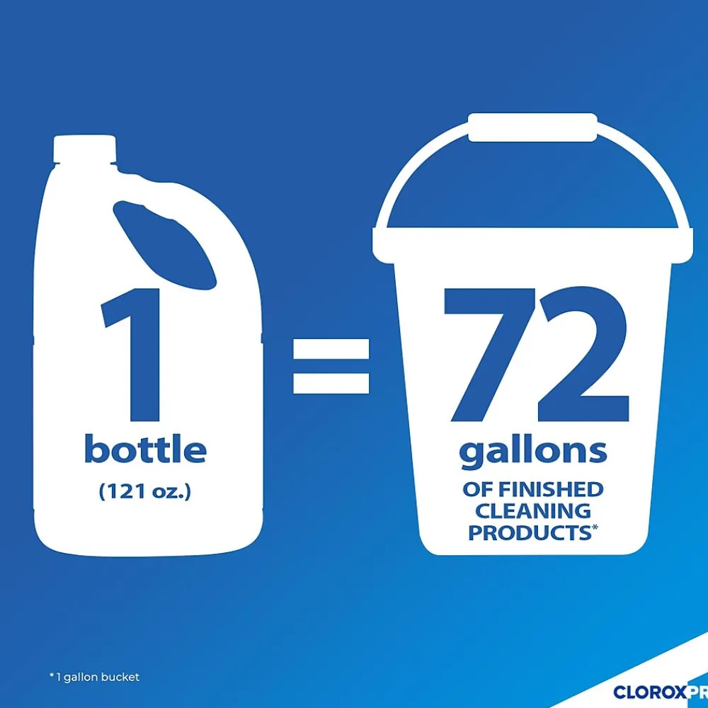 Show those germs who’s boss with Clorox Germicidal Bleach from CloroxPro™. Clorox Germicidal Bleach is EPA-registered to kill 39 organisms, including multiple strains of MRSA, norovirus, flu virus, E. Coli, listeria and Salmonella when used as directed on countertops, floors, toilets and more. It meets EPA criteria for use against SARS-CoV-2, the virus that causes COVID-19. This 121 ounce bottle of bleach makes 30 gallons of germ busting cleaning solution to remove stains and kill mold and mildew. Clorox Germicidal Bleach also can be used in the laundry room to make whites whiter. Clorox Germicidal Bleach removes the toughest laundry stains from white clothes including red wine, grass, dirt and blood stains. It is safe to use in standard and high-efficiency washing machines. Ideal for use in busy healthcare environments, offices, schools and other commercial facilities. CloroxPro™, where clean means everything. Packaging may vary