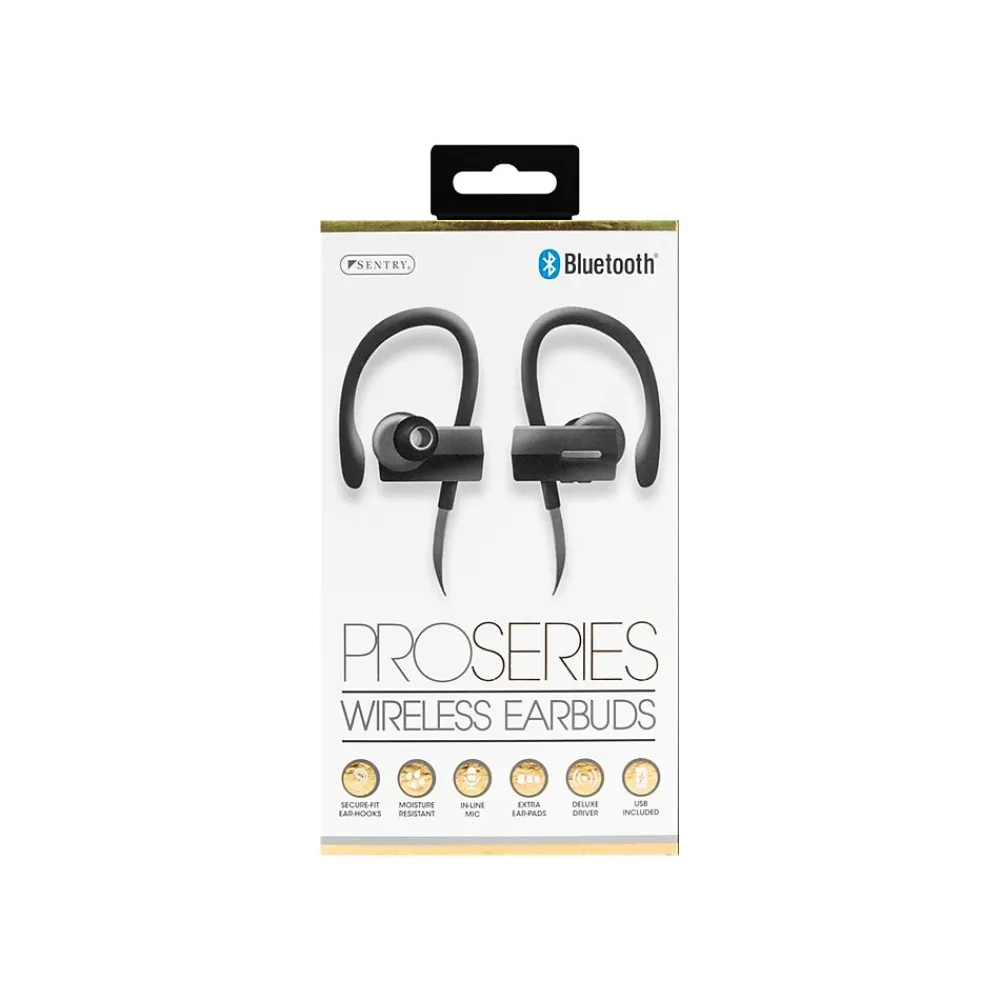Experience high-performance audio with these Sentry Pro Series on-ear headphones. The 10-millimeter drivers deliver rich bass, midrange and treble for a high-quality listening experience, while the Bluetooth capability allows for connection with a wide array of devices. These Sentry Pro Series on-ear headphones have no wires to deliver freedom of movement, and the flexible ear hooks help ensure an optimal fit.