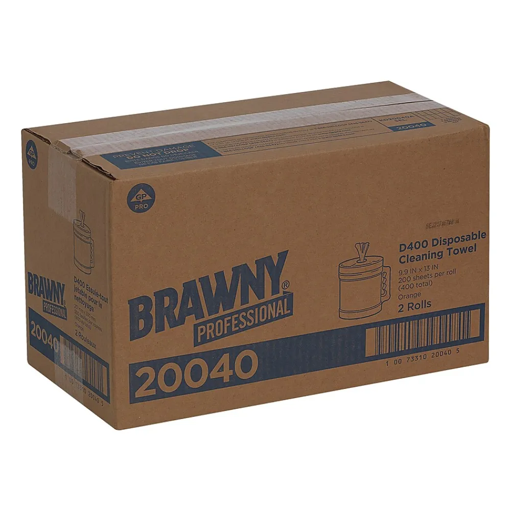 Brawny® Industrial wiper in orange color comes in a tub with pop-top lid, an ergonomic handle to hold wipers clean and dry. Wiper absorbs water and oil on contact, sold as 200 per tub.