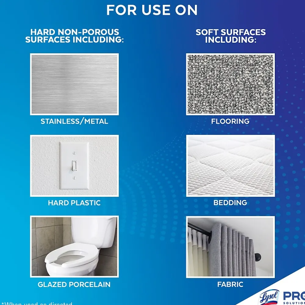 Lysol kills 99.9% of viruses and bacteria, including the virus that causes COVID-19 and cold and flu viruses when used as directed. Help protect high-traffic areas and high-touch surfaces, including desks, bathrooms, doorknobs, and railings. Deliver hospital-type disinfection into soft surfaces, including upholstery, curtains, sofas, mattresses, and cushions. Meet customer and staff expectations around disinfection. Simply spray and let air dry.